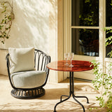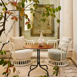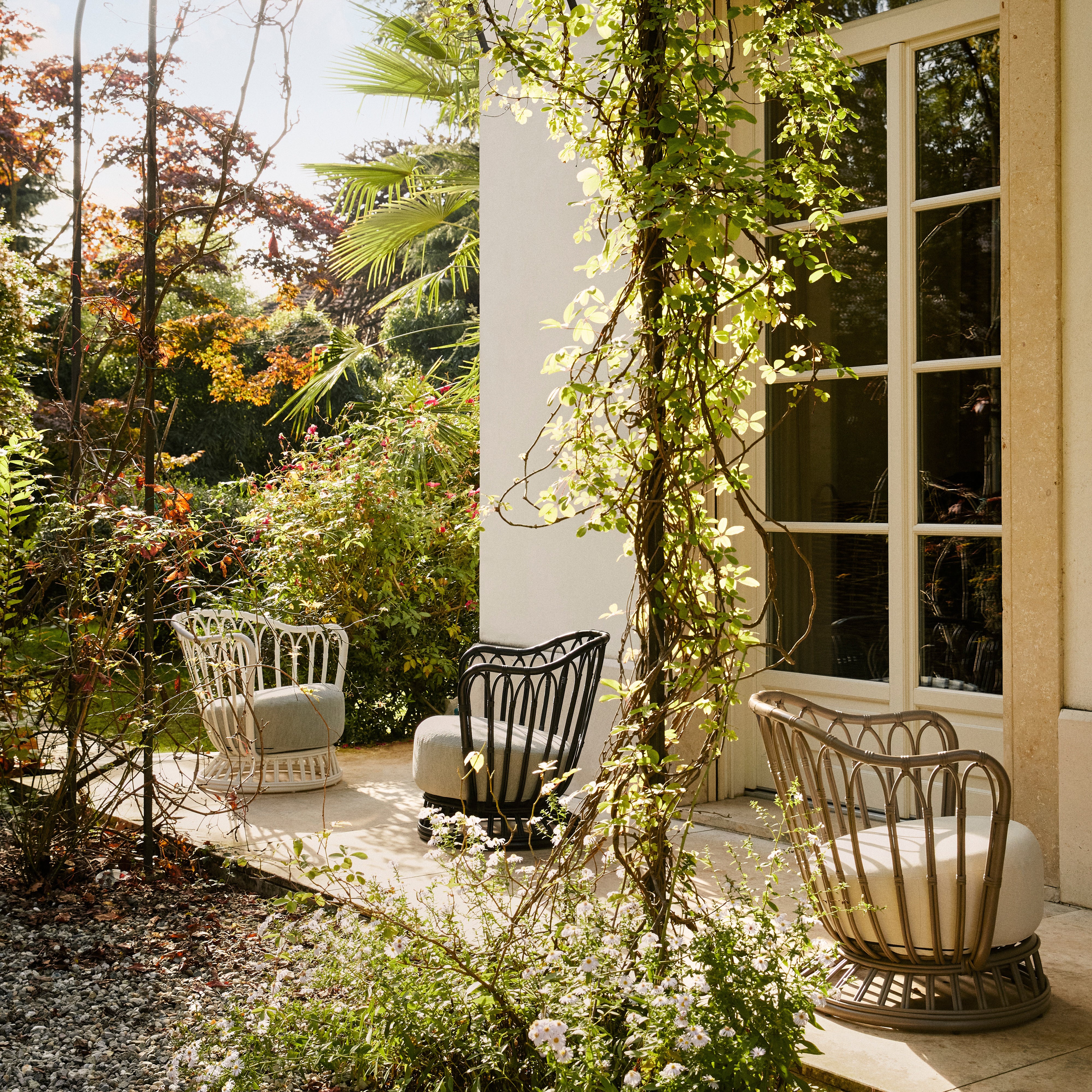 The Grace Lounge Chair is crafted from sustainable rattan, featuring sweeping curves and intricate loops that create a supportive backrest. The fully upholstered seat and plush back cushion offer exceptional comfort. Ideal for both residential and commercial spaces.