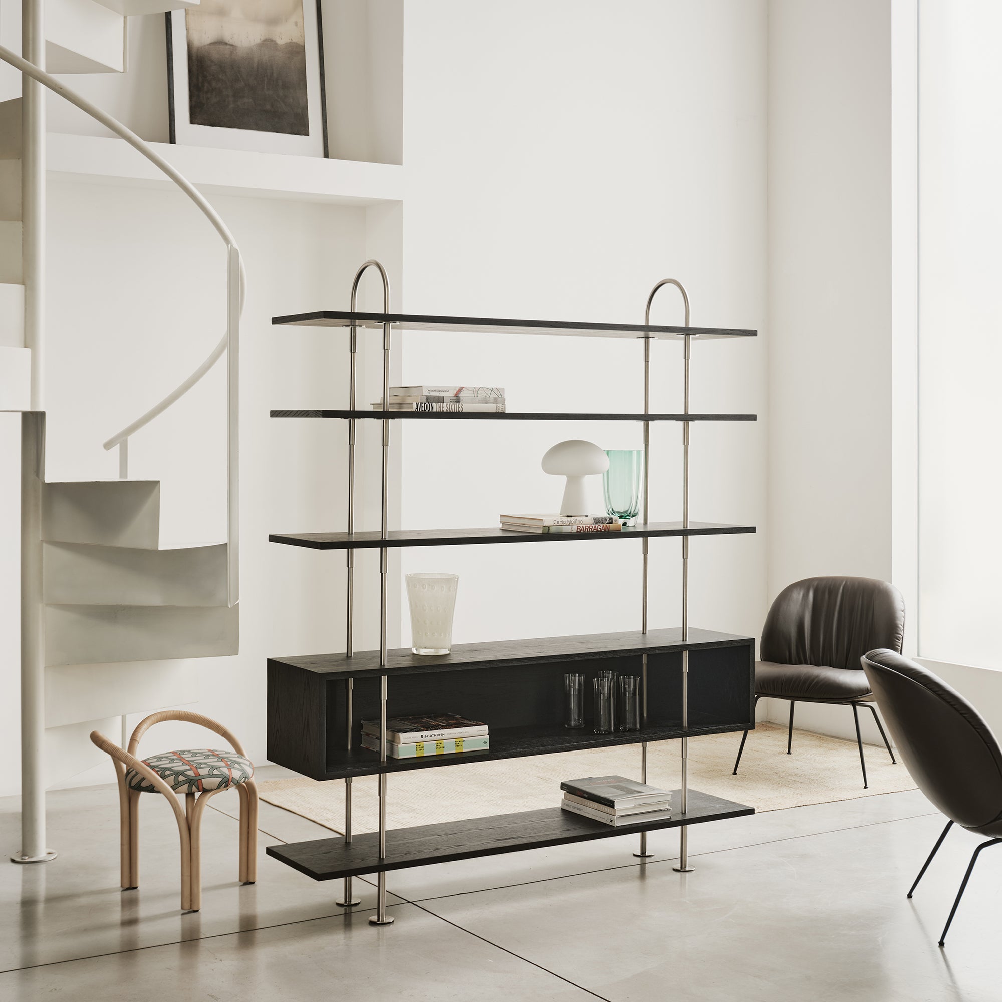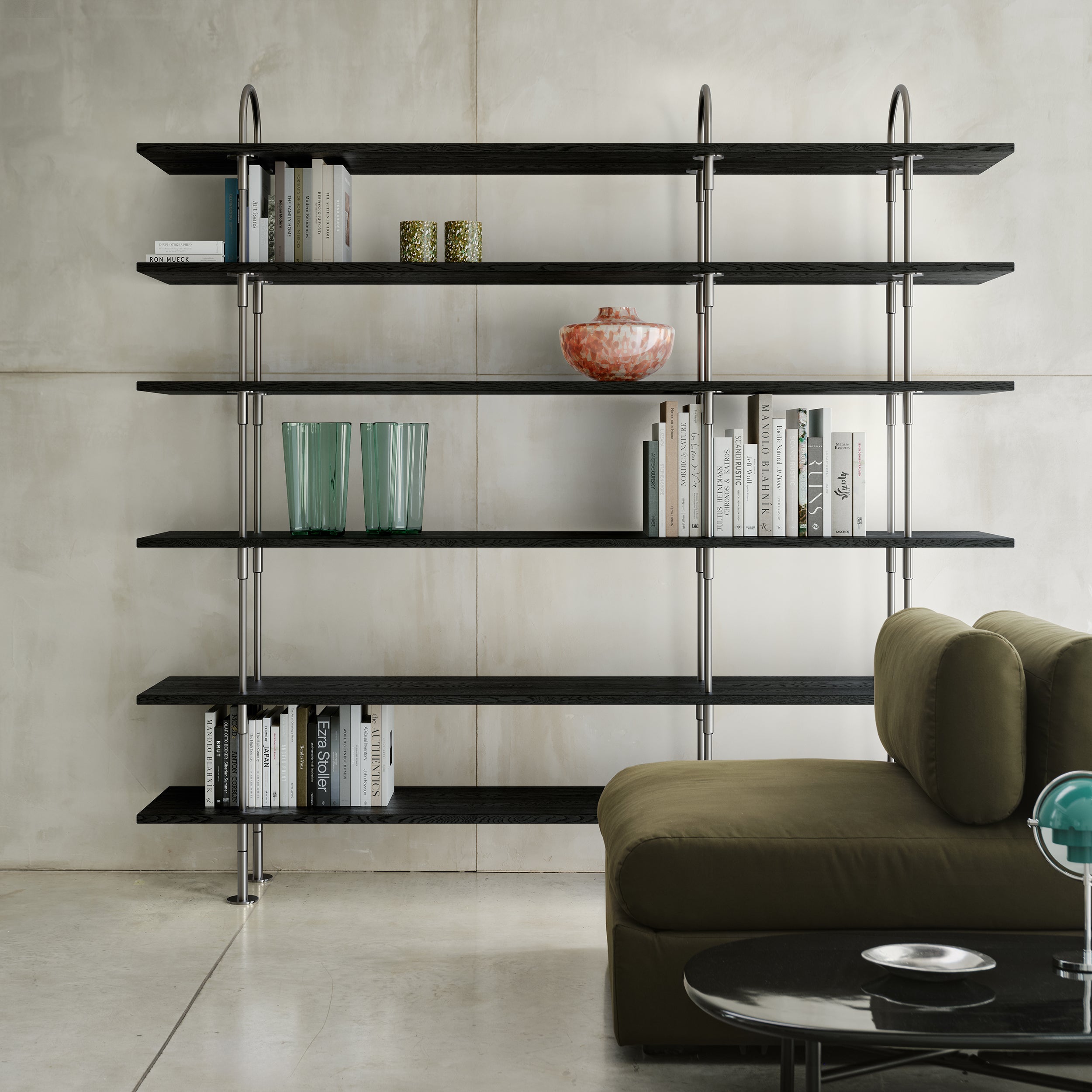 Designed by Linda Korndal’s studio Toko Among Friends for Gubi, the Keen Shelving System is a modular, wall-mounted solution crafted from slim metal rods and arched brackets in stainless steel or blackened brass. Paired with ash veneer or smoked glass shelves, it expands vertically or laterally while maintaining a sculptural, harmonious composition.