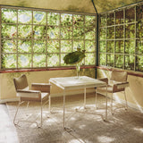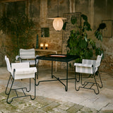 Mathieu Matégot summons the glamour of 1950s Côte d’Azur with his Tropique table and chair. The dining table’s steel mesh tabletop is pressed and welded onto the sturdy rod frame. The statement curve at the feet is a signature of this Hungarian-born, Parisian designer’s expressive style and propensity in fashioning metal for decor and furnishings.