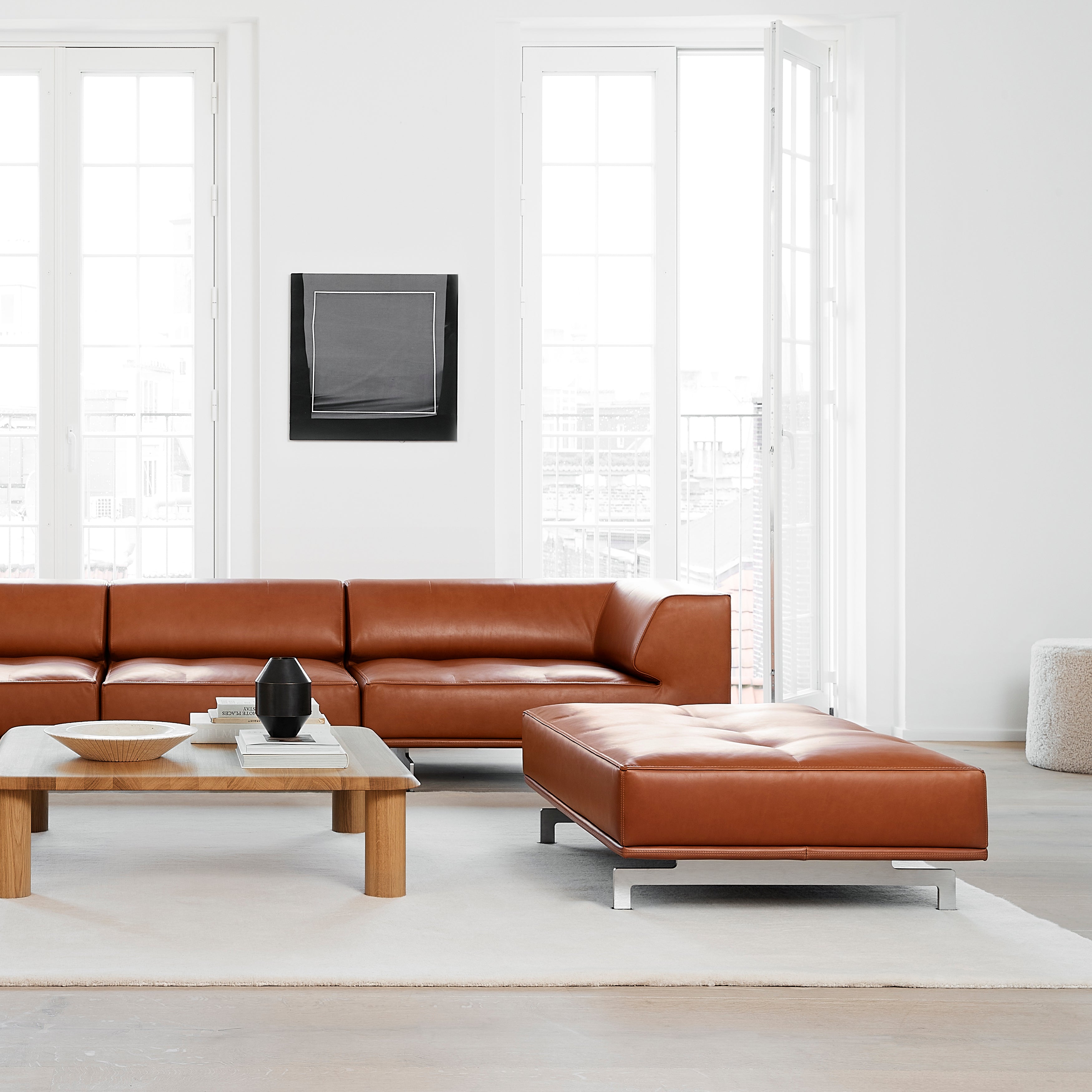 A wide, low-slung profile makes the Delphi Elements Ottoman 120 adaptable for use as a footrest, extra seat, or chaise extension. Designed by Swiss designer Hannes Wettstein, this piece features an inner wooden frame with no-sag springs, cold-cured foam, and a foam duvet, ensuring lasting comfort. The ottoman is upholstered in fabric or leather and rests on a brushed aluminum or solid wood base. It integrates seamlessly into Fredericia’s modular Delphi Elements series.