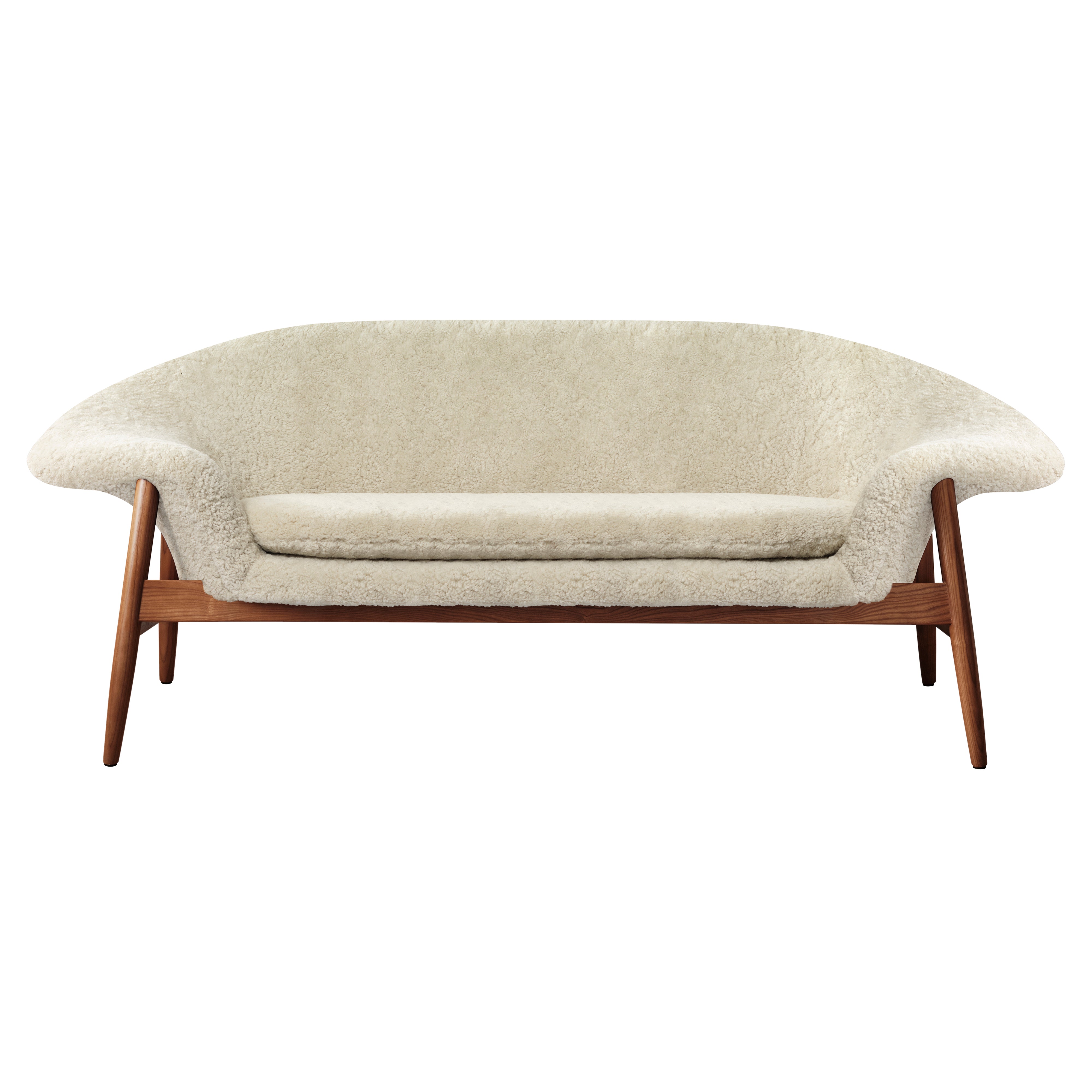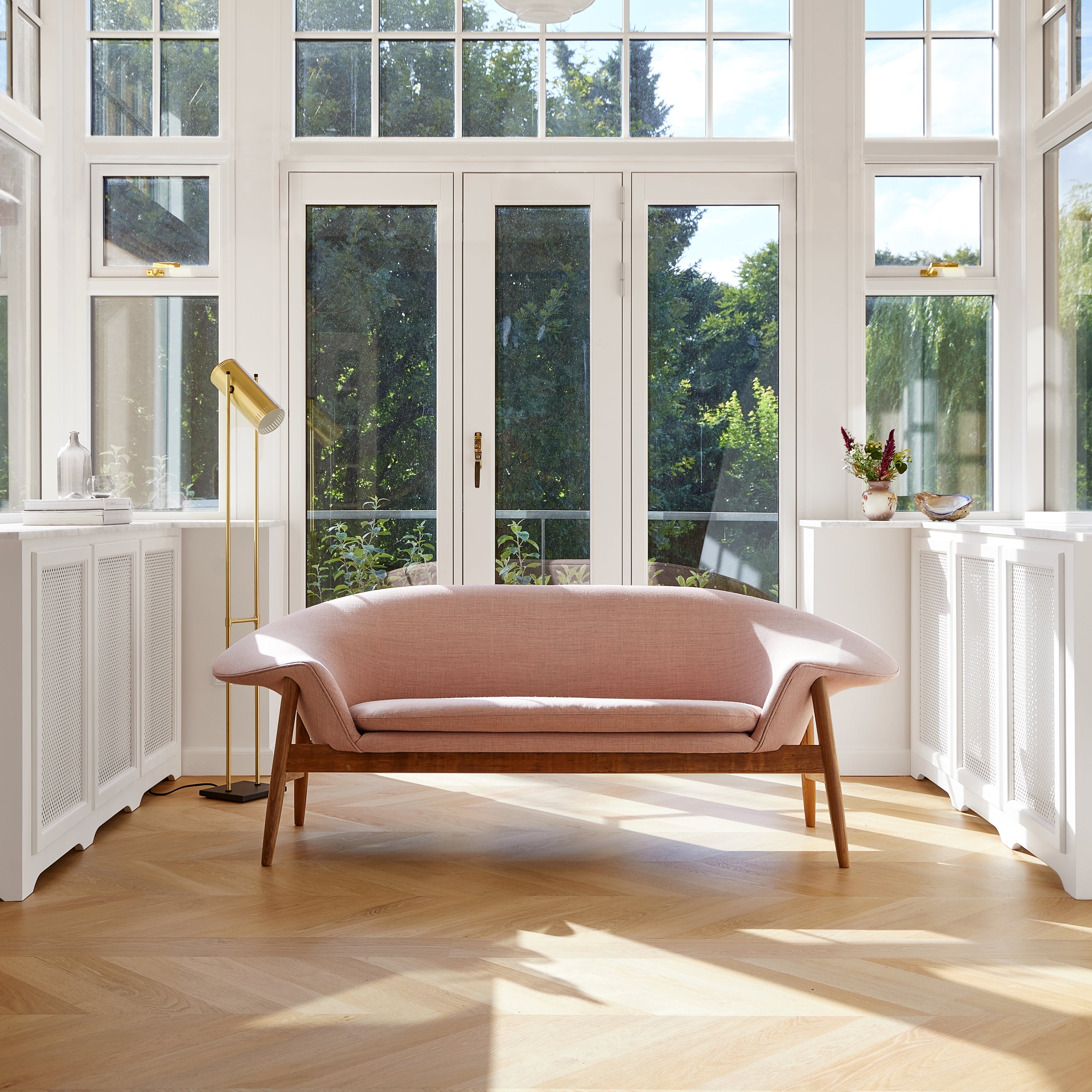 The Fried Egg Sofa has its roots in Danish modernism of the ‘50s, metamorphosed in a current collaboration between architect Hans Olsen's descendants and Warm Nordic. Adapted from the design icon’s original asymmetrical armchair with notably flat armrests, the sofa extends those playful lines, set on an oiled solid-teak frame.