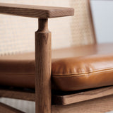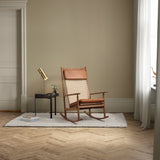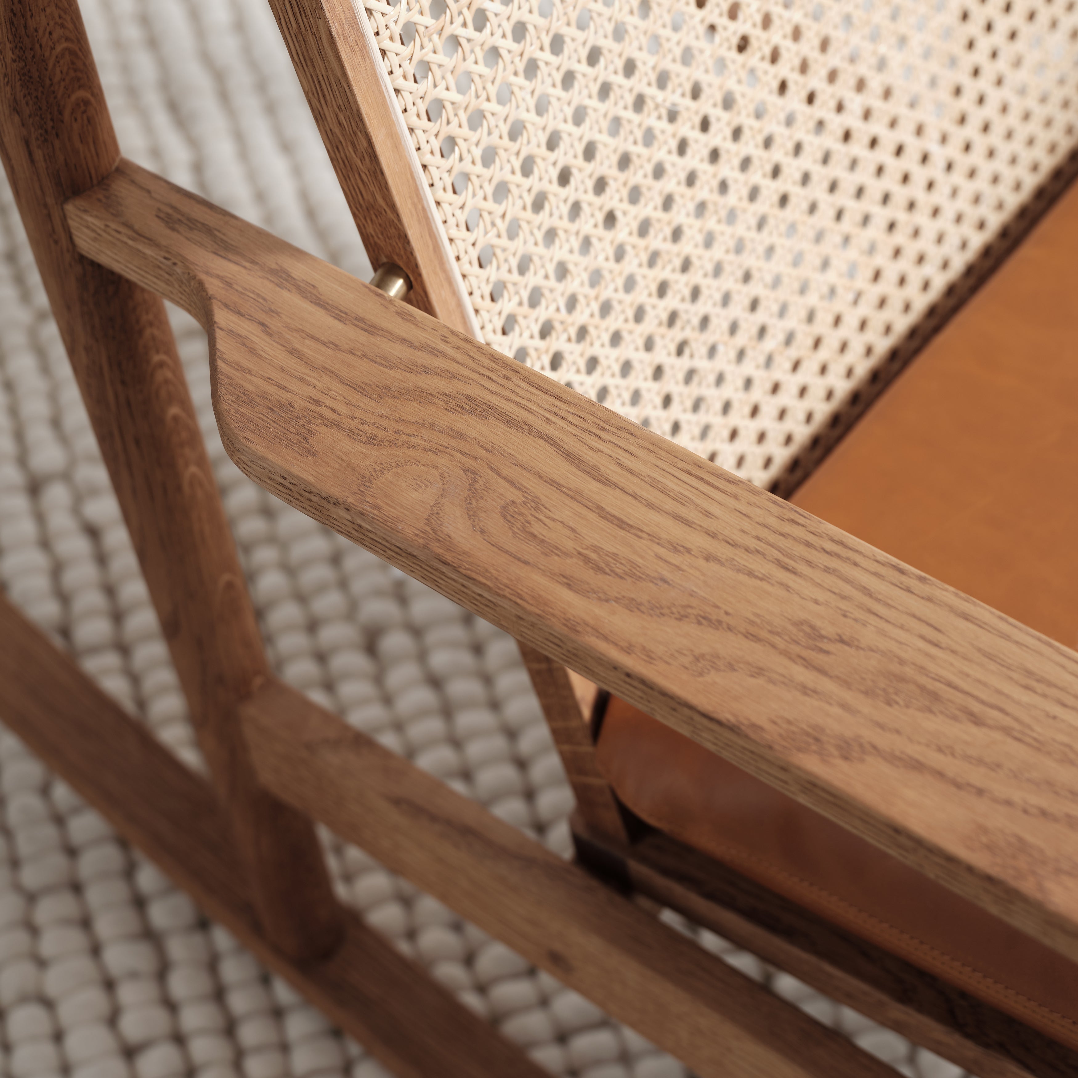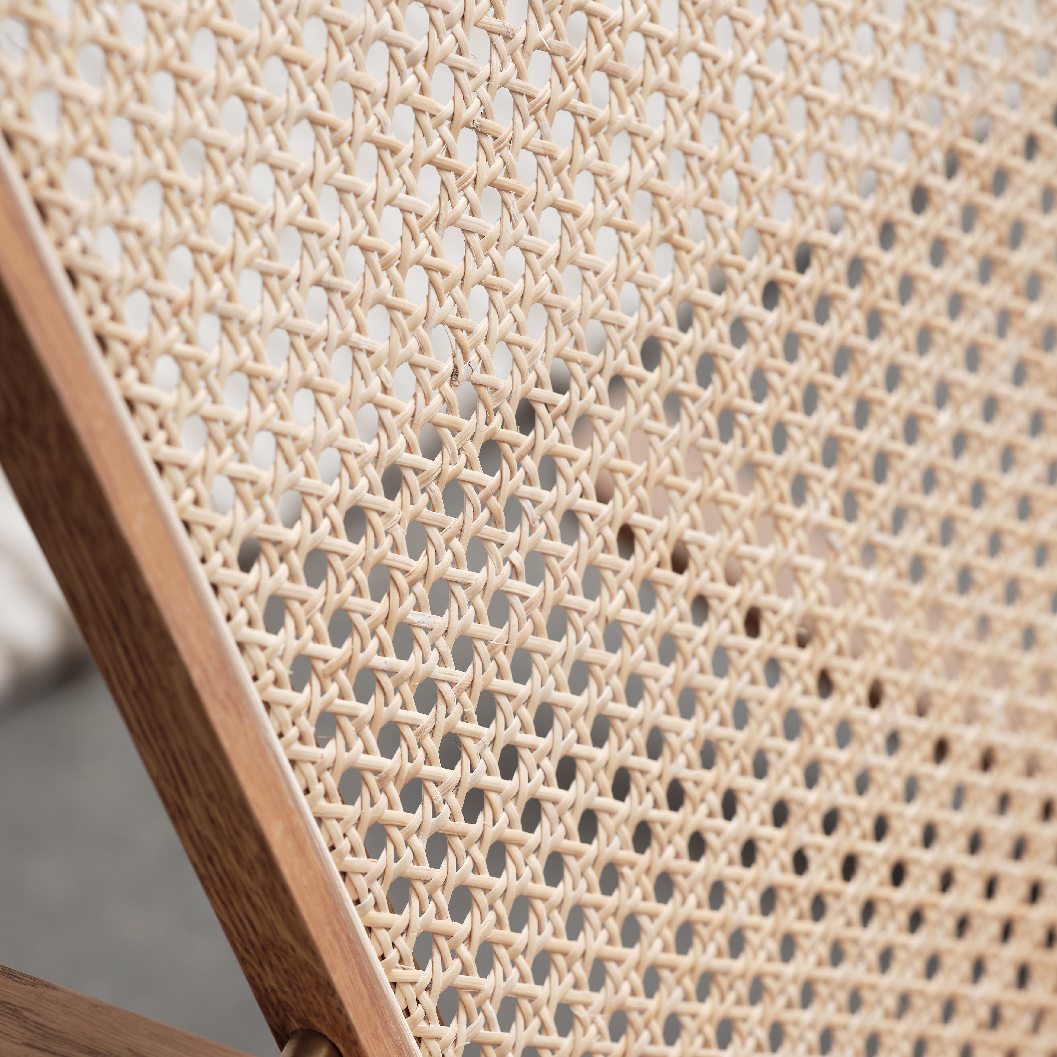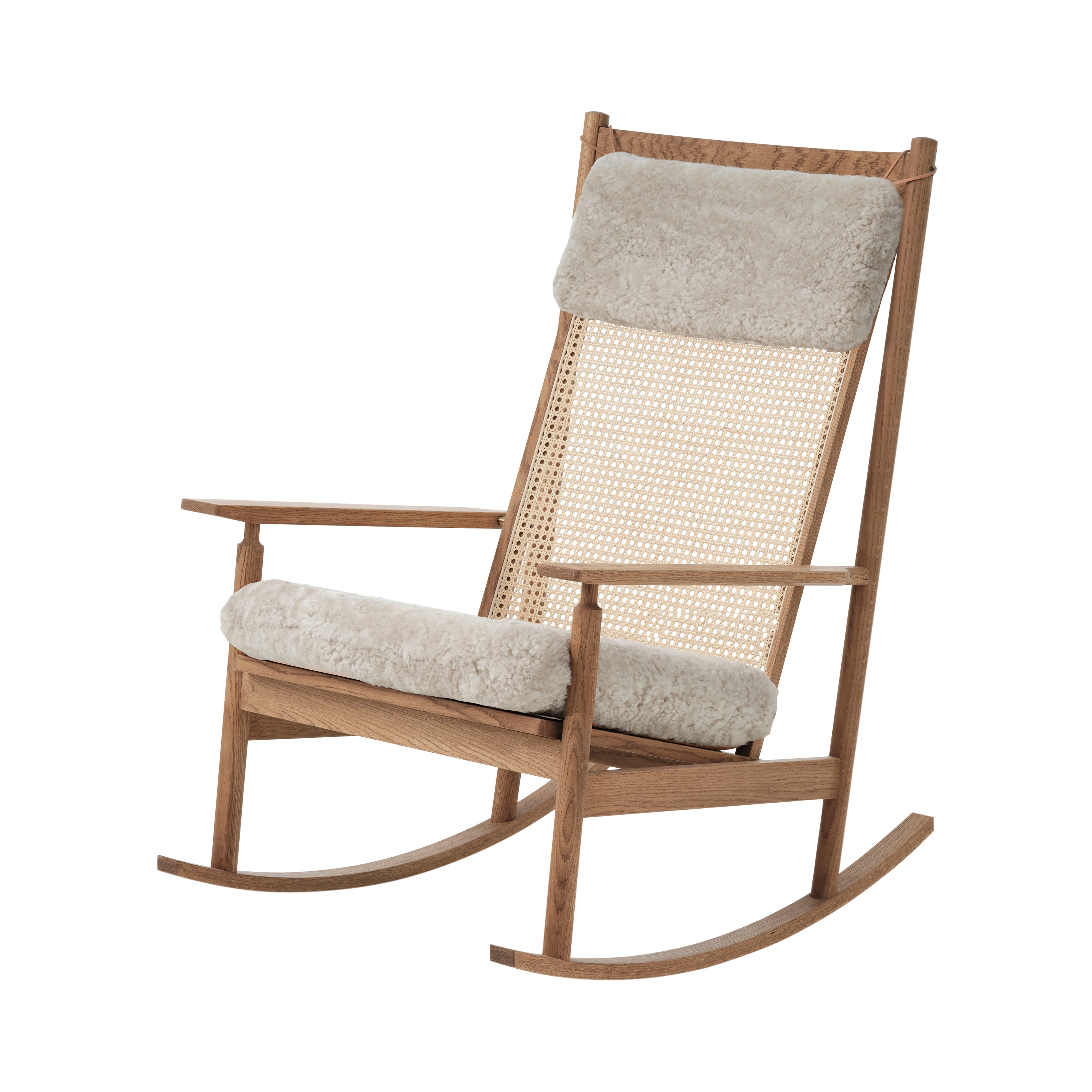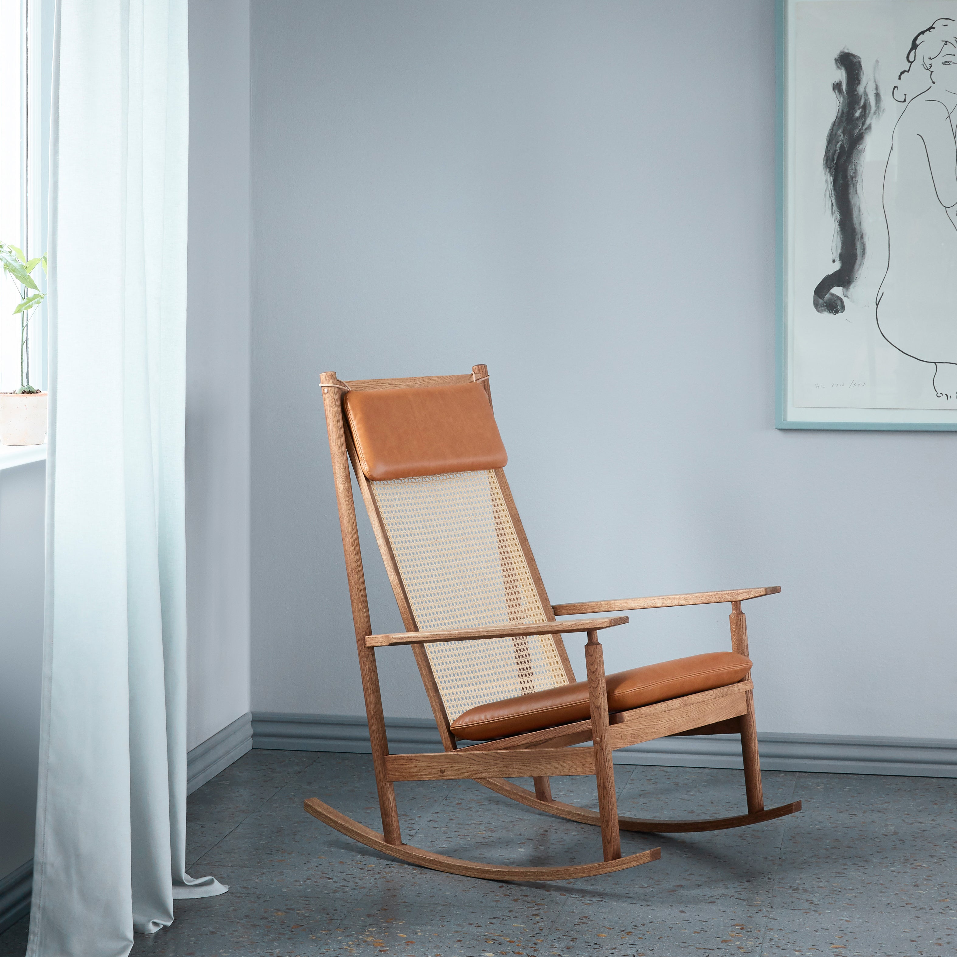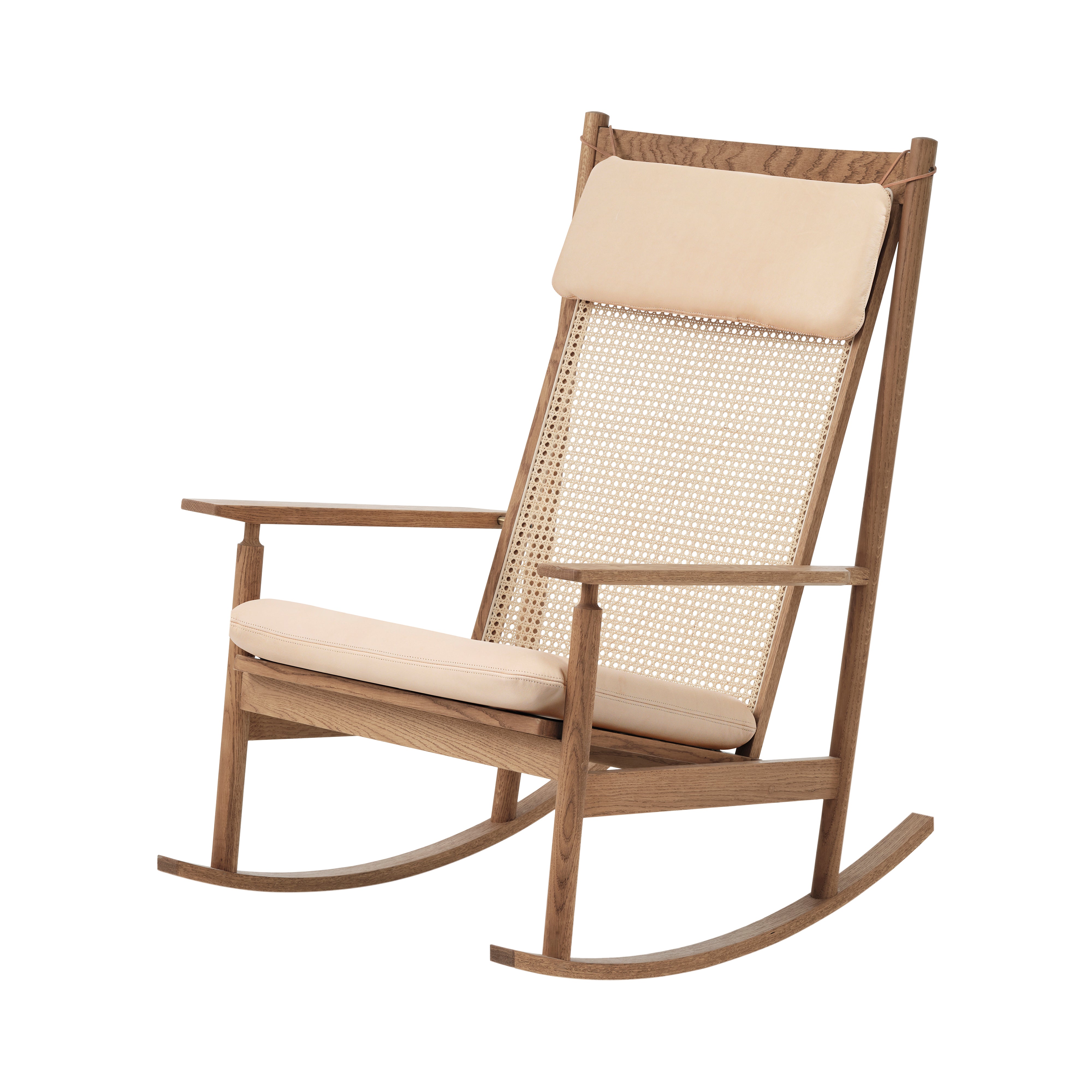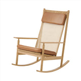 The Swing Rocking Chair, designed by Hans Olsen, offers both relaxation and craftsmanship in true Scandinavian style. Its oak frame—available in teak oiled and white oiled oak finishes—supports a beautifully woven French cane backrest. For enhanced comfort, the chair includes a soft seat cushion and an adjustable headrest pillow, making it perfect for extended lounging.
