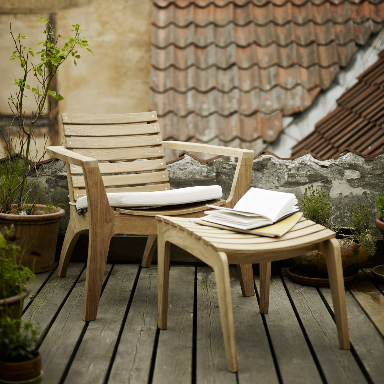A complement to the collection's lounging chair or garden bench, Regatta's footrest means it's time to stretch out and relax in style. The lounge stool repeats the curved lines that give a contemporary fillip to the notion of wood outdoor furniture. Designed by Hans Thyge & Co, the design studio based in both Denmark and China, and faultlessly crafted in solid teak.