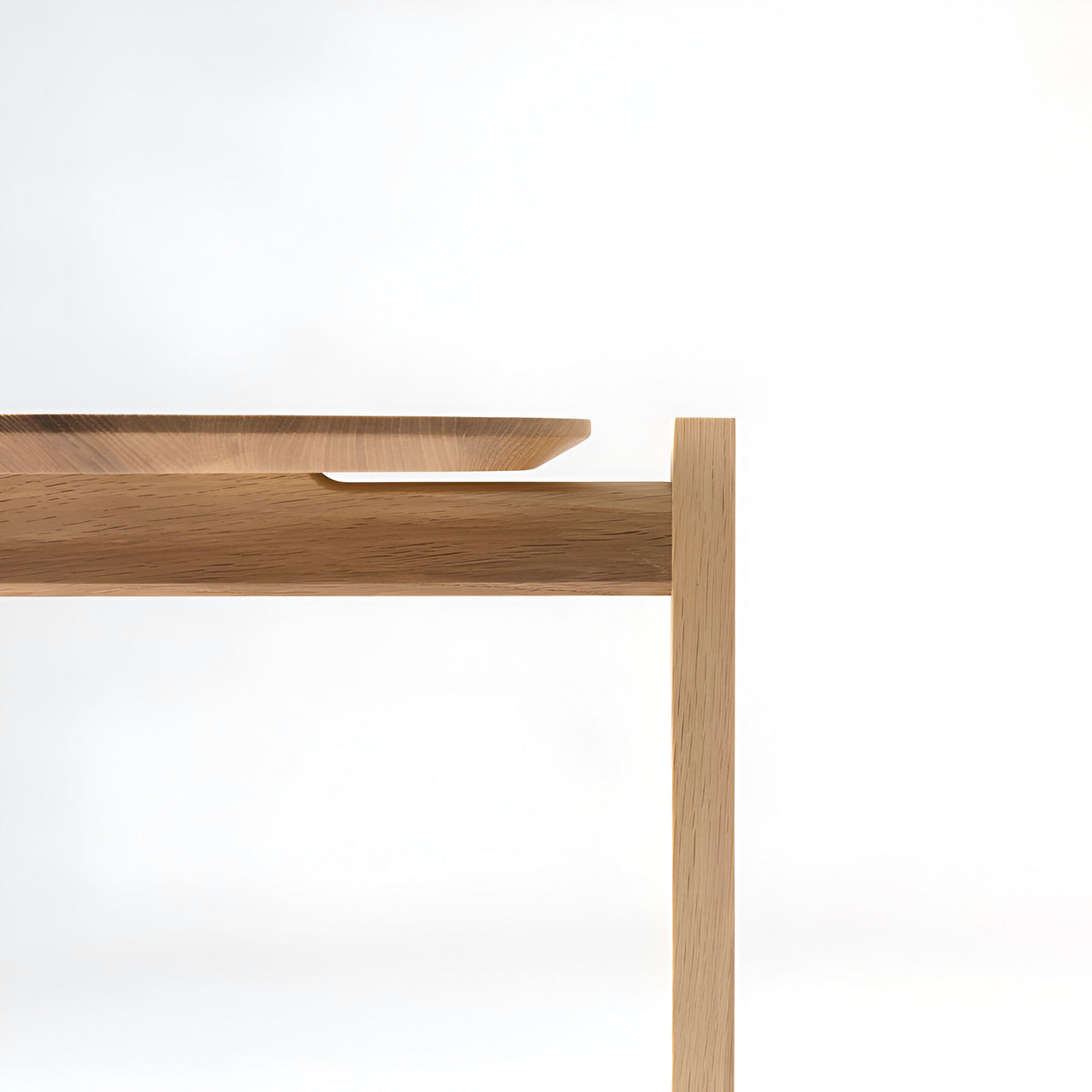 The Suwari Side Table Sangyo is crafted from Japanese oak with a polyurethane resin finish, featuring vertical lines that allow it to integrate seamlessly into different spaces. Designed by Kenya Hara, it focuses on essential design elements, creating pieces that complement their surroundings without overpowering them.