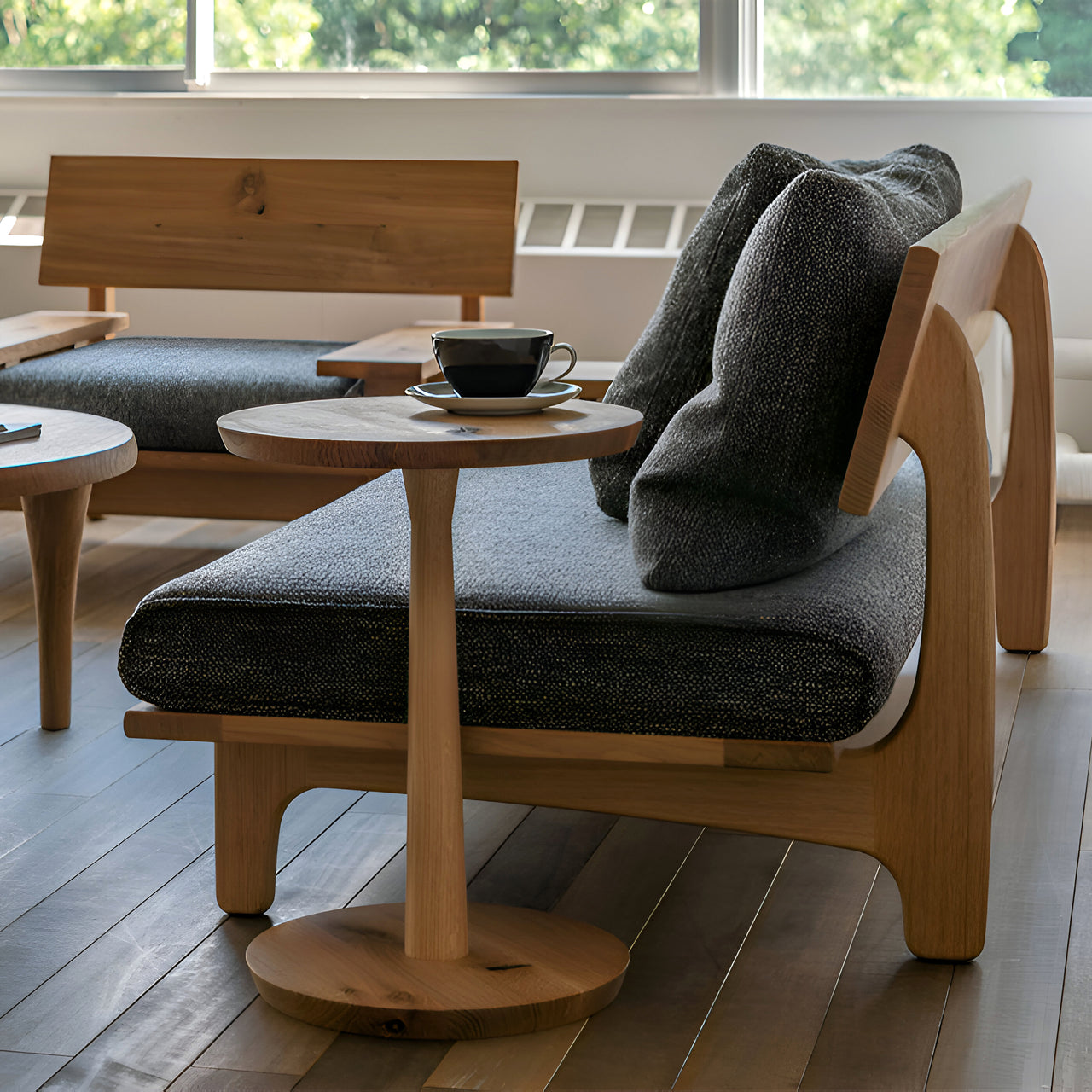 The Words from Forest Side Table, designed by Toshimitsu Sasaki, highlights the natural character of wood by showcasing its unique knots, vertical grain, heartwood, and sapwood. This approach not only brings out the wood's details but also supports sustainable forest resource use.