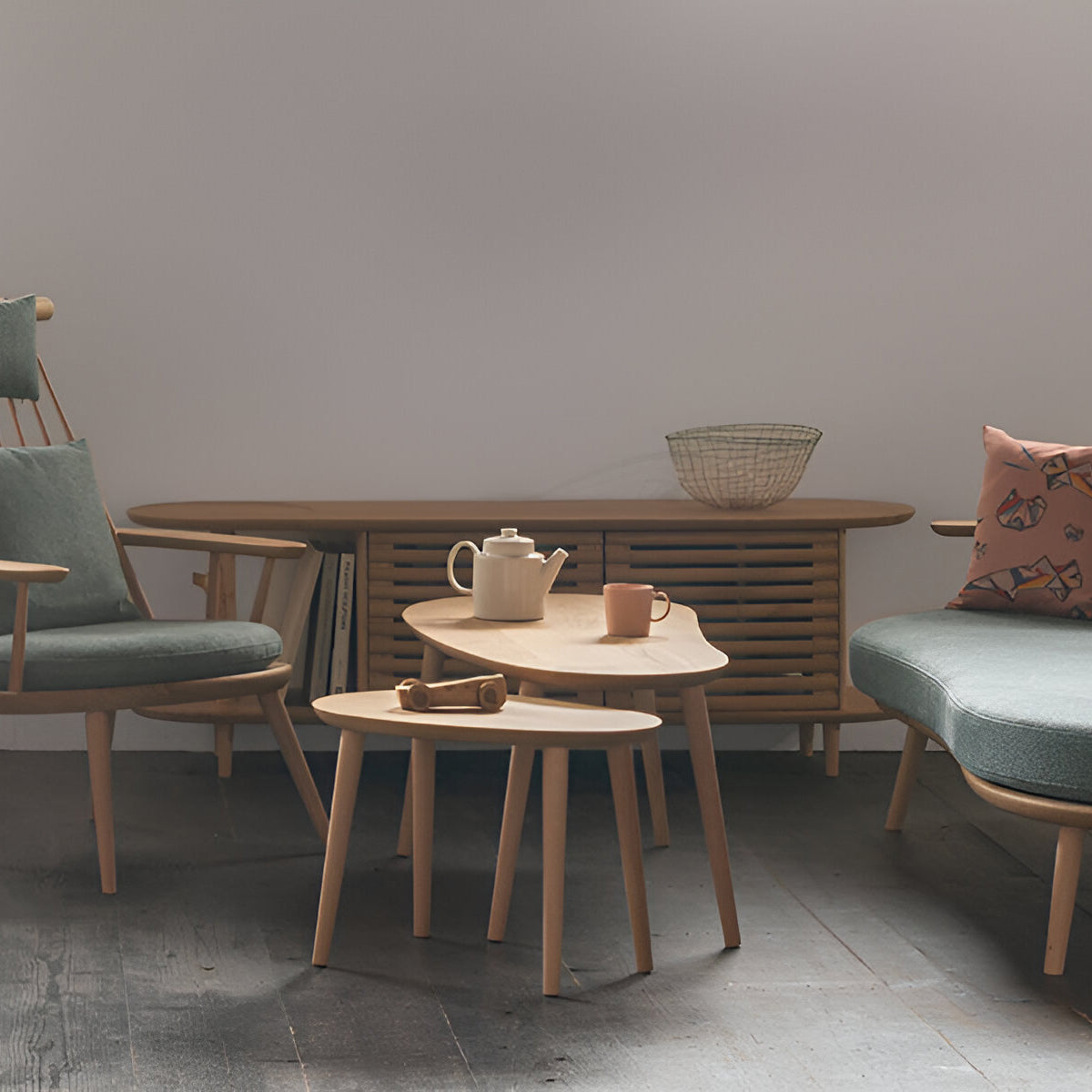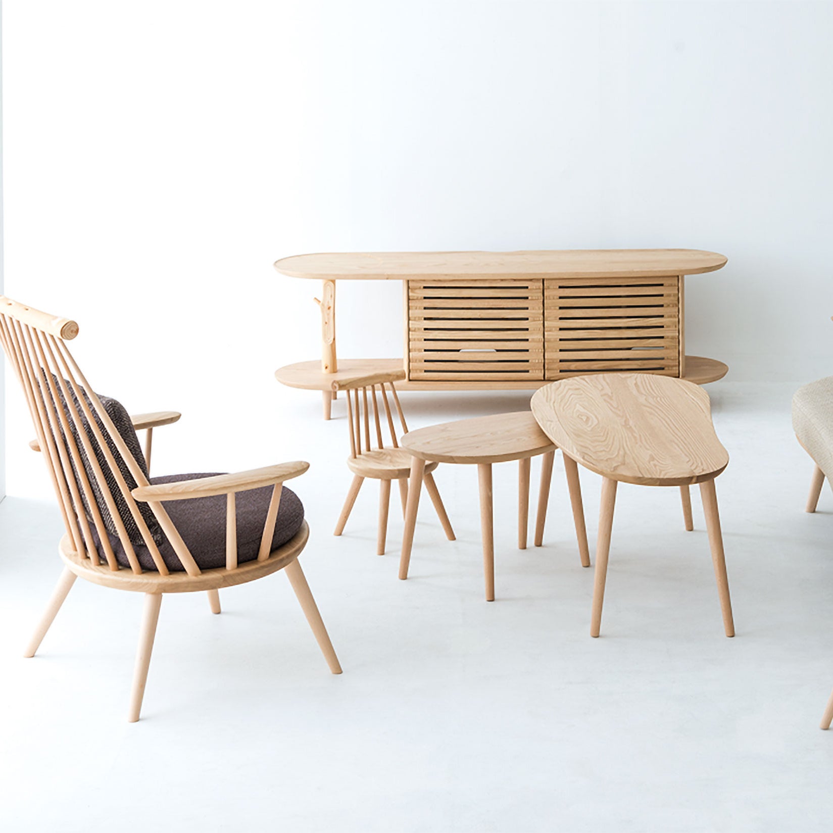 The Kinoe Nesting Table features a Japanese chestnut top and Japanese beech legs, highlighting the natural grain patterns of the wood. Its nesting design allows for flexible use and space-saving storage, making it suitable for a range of interior spaces.