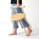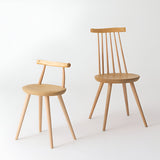 The Kinoe Chair showcases a top rail made from natural Japanese cedar or Hinoki (cypress) branches, giving each piece its own unique character. The seat is crafted from Japanese chestnut, while the legs and spokes are made from Japanese beech, highlighting the distinctive grain and texture of the wood. This thoughtful design uses materials that might otherwise go unused, celebrating the beauty of organic shapes and natural variations.