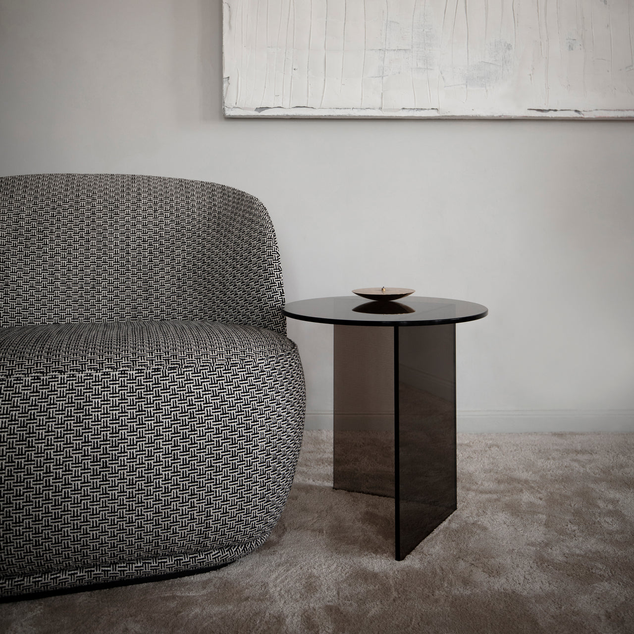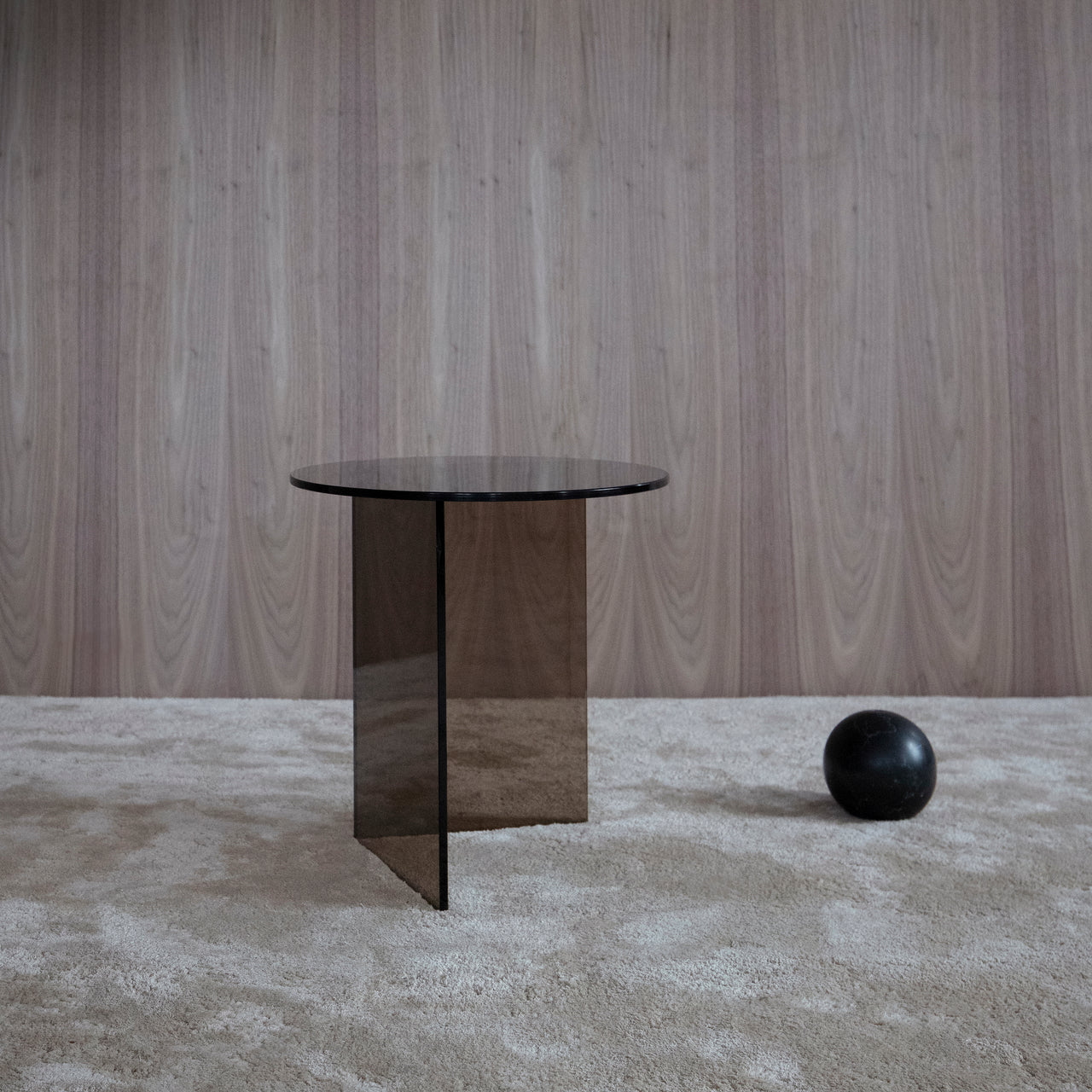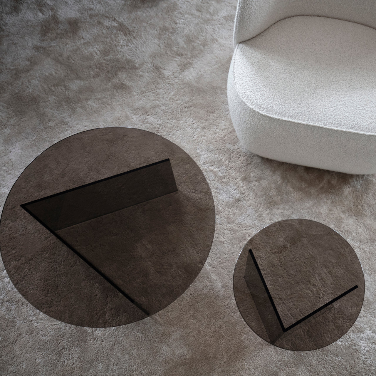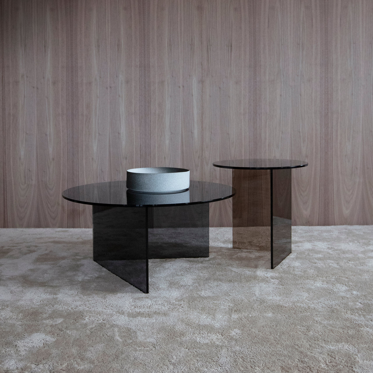 Pond was suggested by reflections on the water’s surface as translated to the occasional table’s layered panes of glossy glass in clear, grey smoke or bronze. Angled base cuts play against a round top, tightly hand-sealed using UV-resistant glue by European craftsman in a process that requires high finesse. Apropos in public and residential contexts, the duo can be deployed singly or as a set.