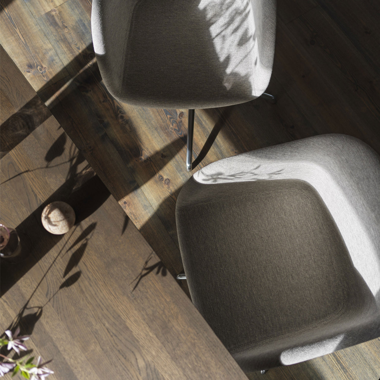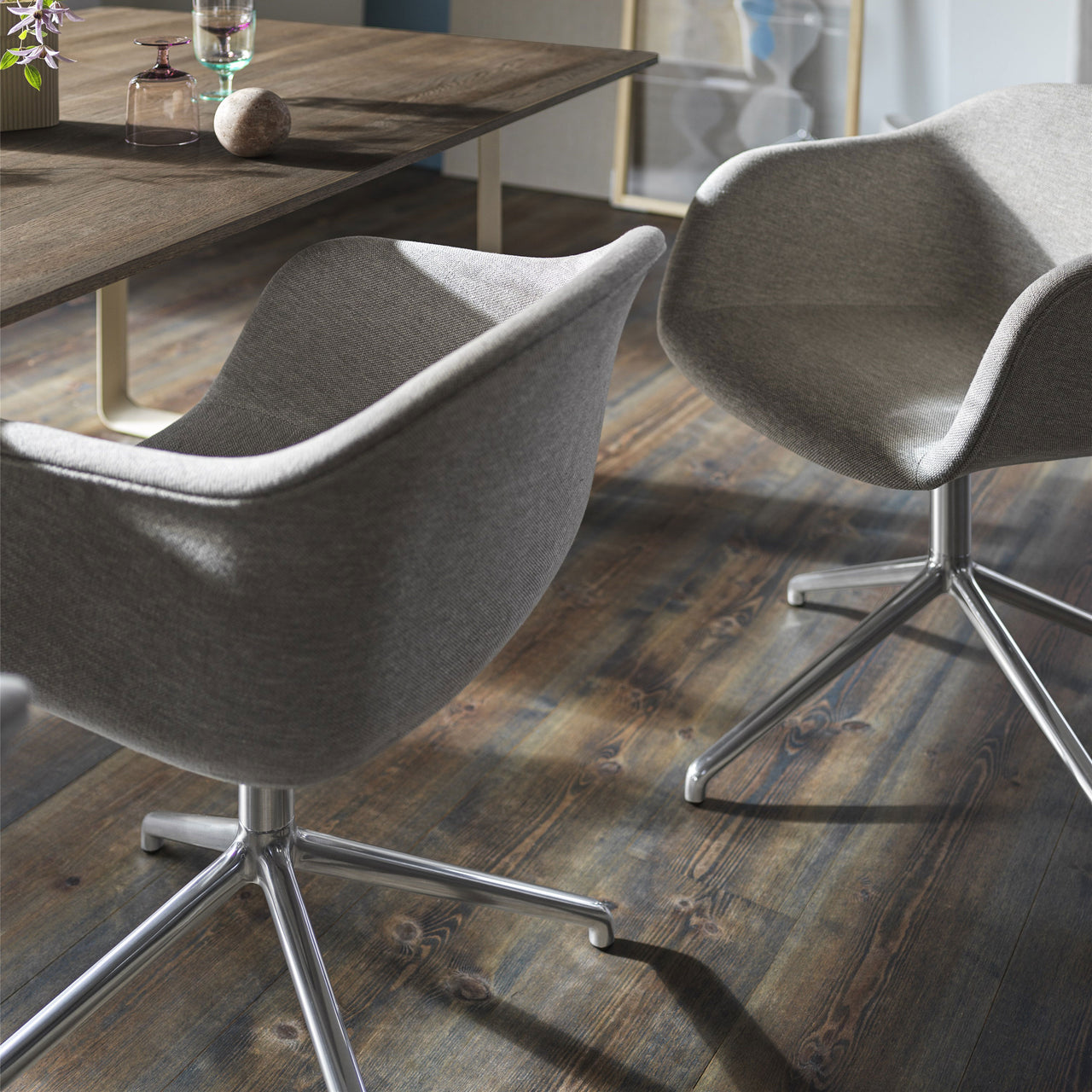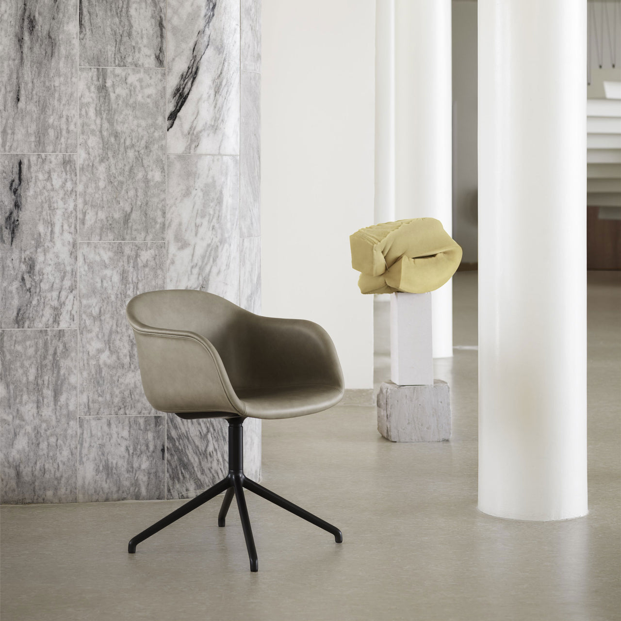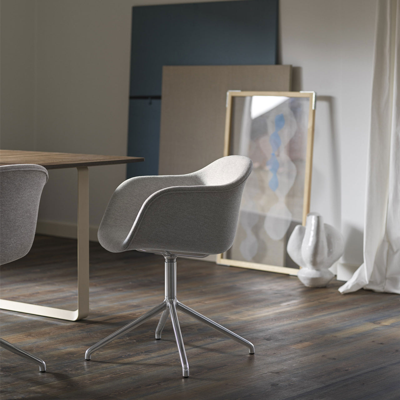 Upholstery adds a luxurious overlay to the Fiber Chair, called "design without eccentricity" from Copenhagen-based creative duo Iskos-Berlin. In this swivel base version especially suited to a desk or work table, the designers reworked the classic shell chair, updating this minimalist molded form in an innovative material consisting of a mix of plastic and wood fiber. Friendly and embracing curves provide extended comfort while taking up relatively little space in a room.