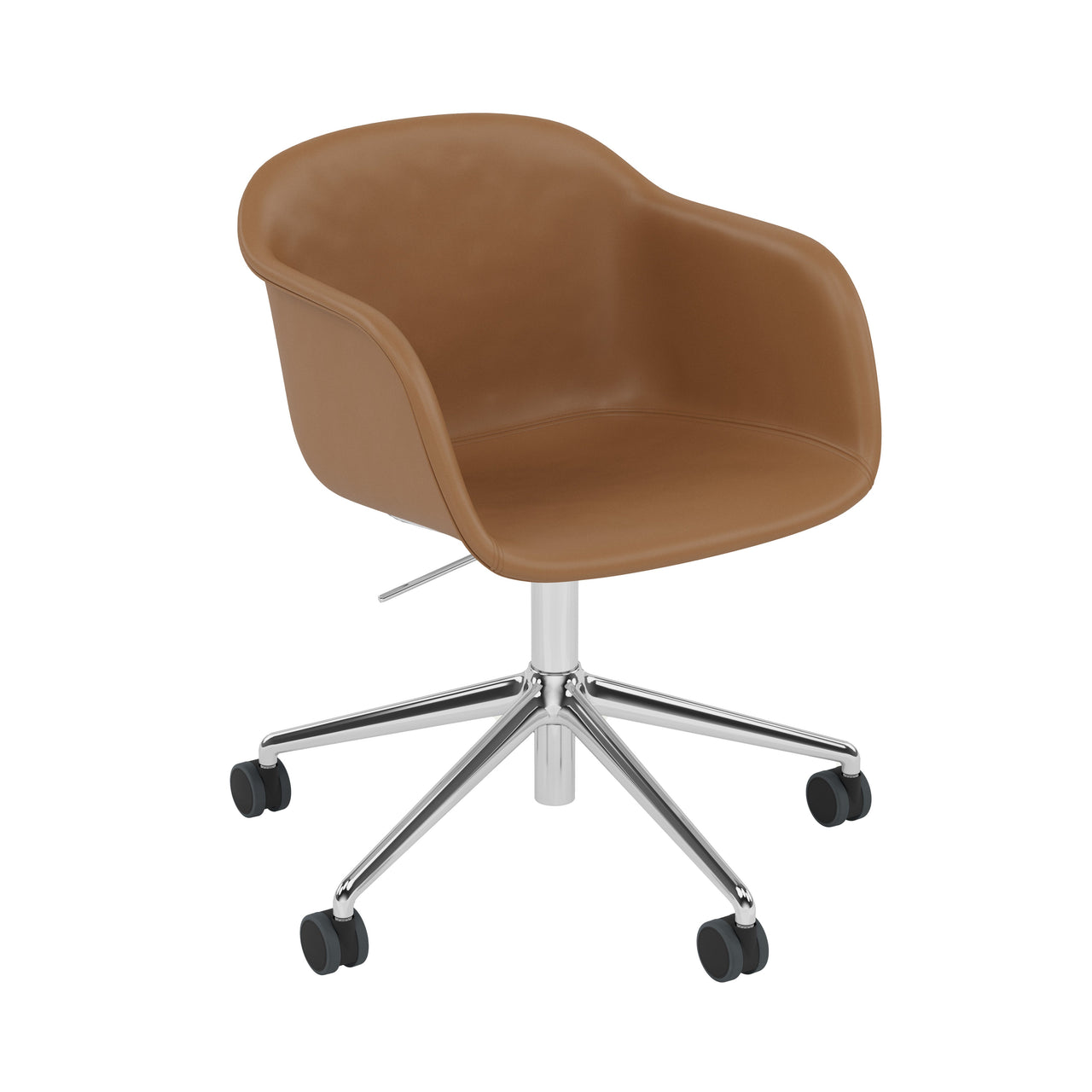 Iskos-Berlin's office seating Fiber gets the ultimate treatment in both customization and workability. Completely upholstered in a premium textile or fine leather, the armchair's interior molded shell yields its comfortable contours. And, along with its pivoting swivel base set on castors for effortless movement, the chair height is instantly adjusted via gaslift.