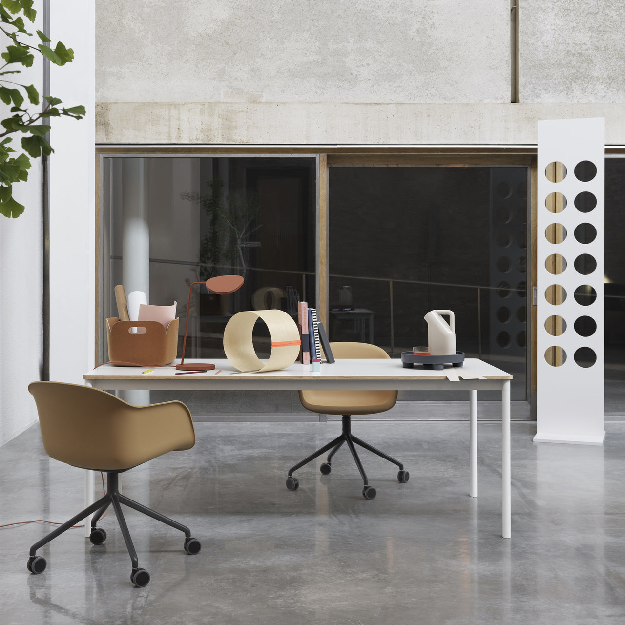With a swivel base and castors for easy mobility, this armchair Fiber version is especially suited to a desk or conference table. From Danish brand Muuto, the design duo Iskos-Berlin hews to a "design without eccentricity" baseline. The molded seating in a composite plastic with 25 percent wood fibers retains its sculptural edge while offering a pleasing matte look and smooth finish.