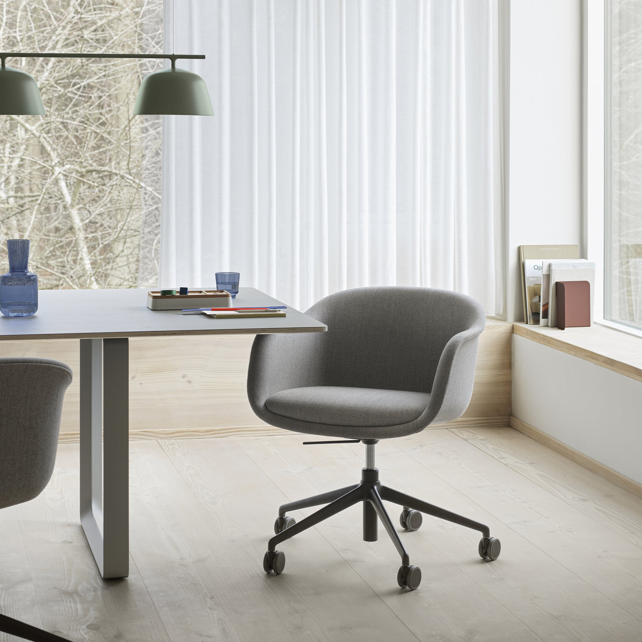 With splendid upholstery in leather or textiles, this version of Fiber Conference Armchair from Muuto ticks all the boxes, equipped with rolling castors, gaslift to adjust seat height and a useful tilt function. With its sculptural design and exceedingly comfortable ergonomics, the seating conceived by Copenhagen-based Iskos-Berlin is up to the task, whether in office or WFH. The chair's inner shell is made of 99% recycled plastic and fully upholstered, along with a soft fixed cushion.