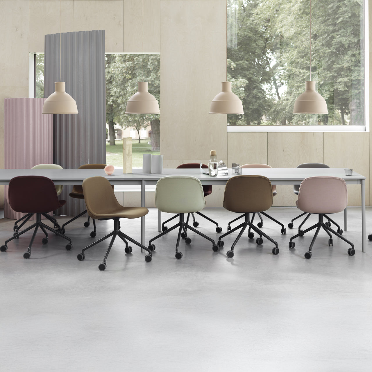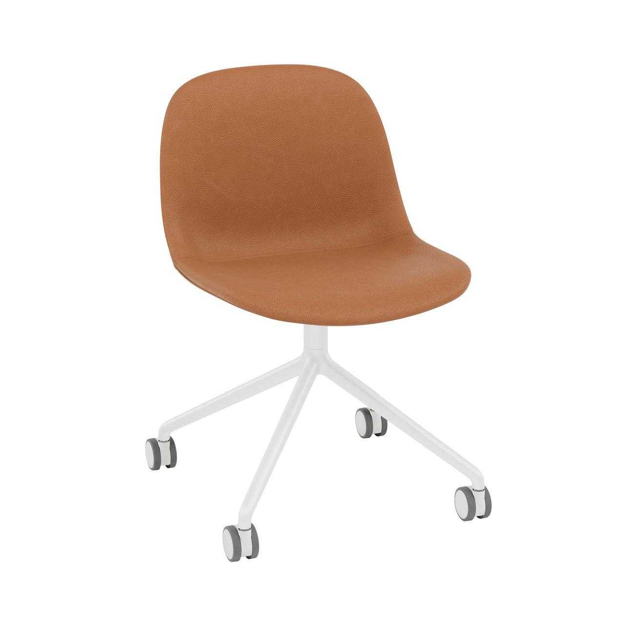 With its office-friendly rolling swivel base, this comfortably cushioned side chair clad in either leather or fabric extends Muuto's Fiber collection. Copenhagen-based design duo Iskos-Berlin offer defining versatility in their reworking of the classic molded chair without sacrificing comfort. Their updated shell seating features an innovative composite of plastic and wood fibers for the underlying form, with a soft matte texture to complement the upholstery.