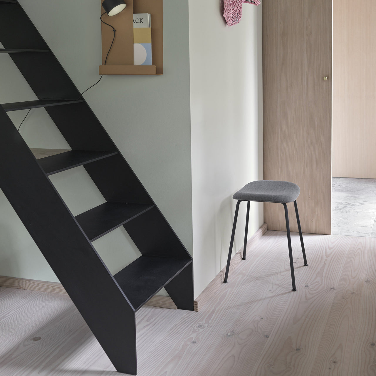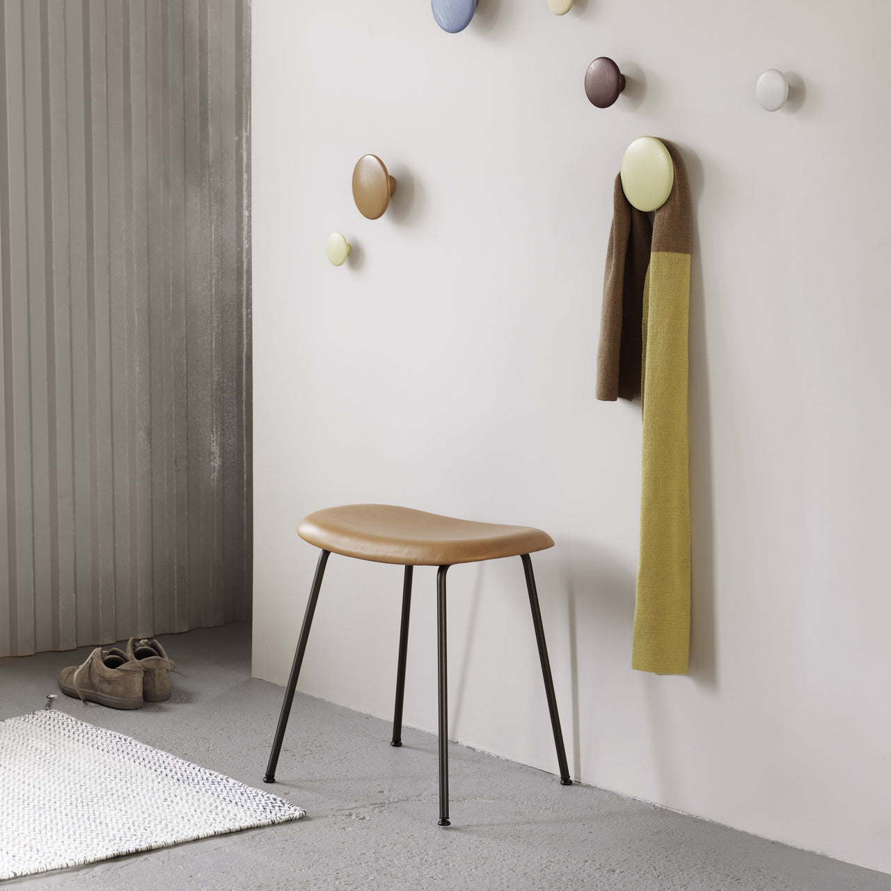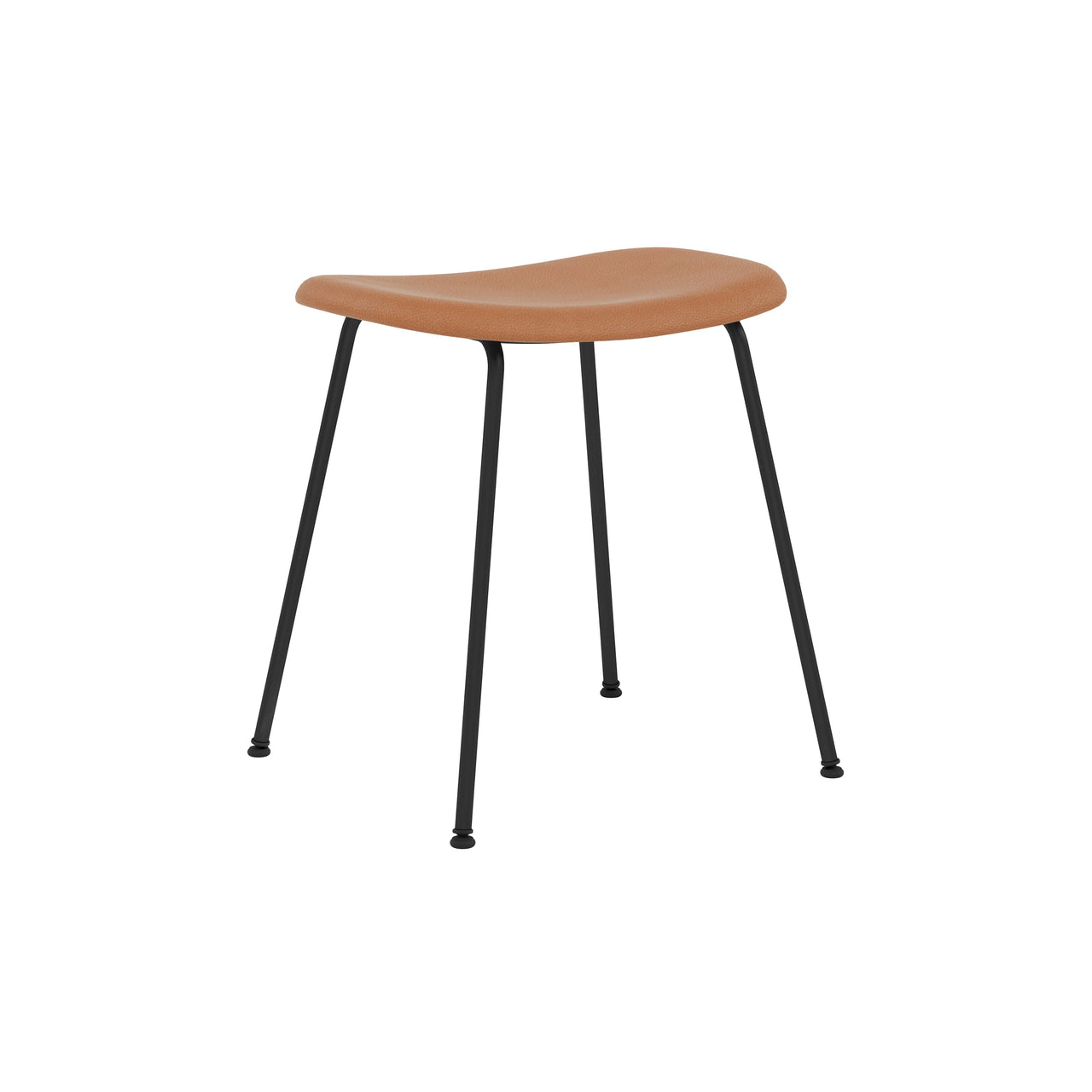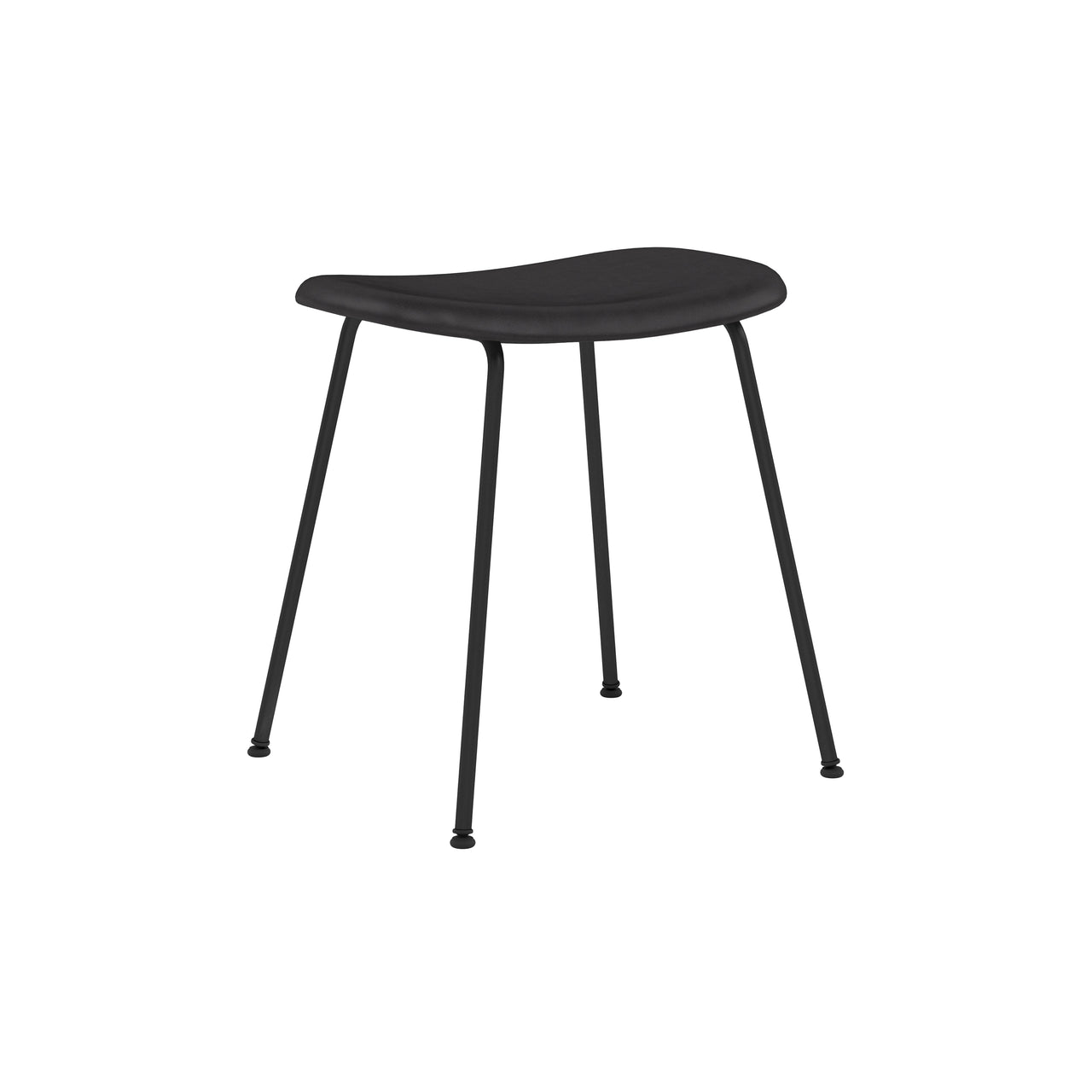 A luxurious leather overlay elevates this refined stool from the Fiber range by designers Iskos-Berlin for Danish maker Muuto. Inspired by the heritage shell chair, the underlying molded plastic seat is made from an innovative plastic composite with 25 percent wood fibers. Black tubular base in powder-coated steel imparts a crisply linear appearance that melds with a variety of interior settings.