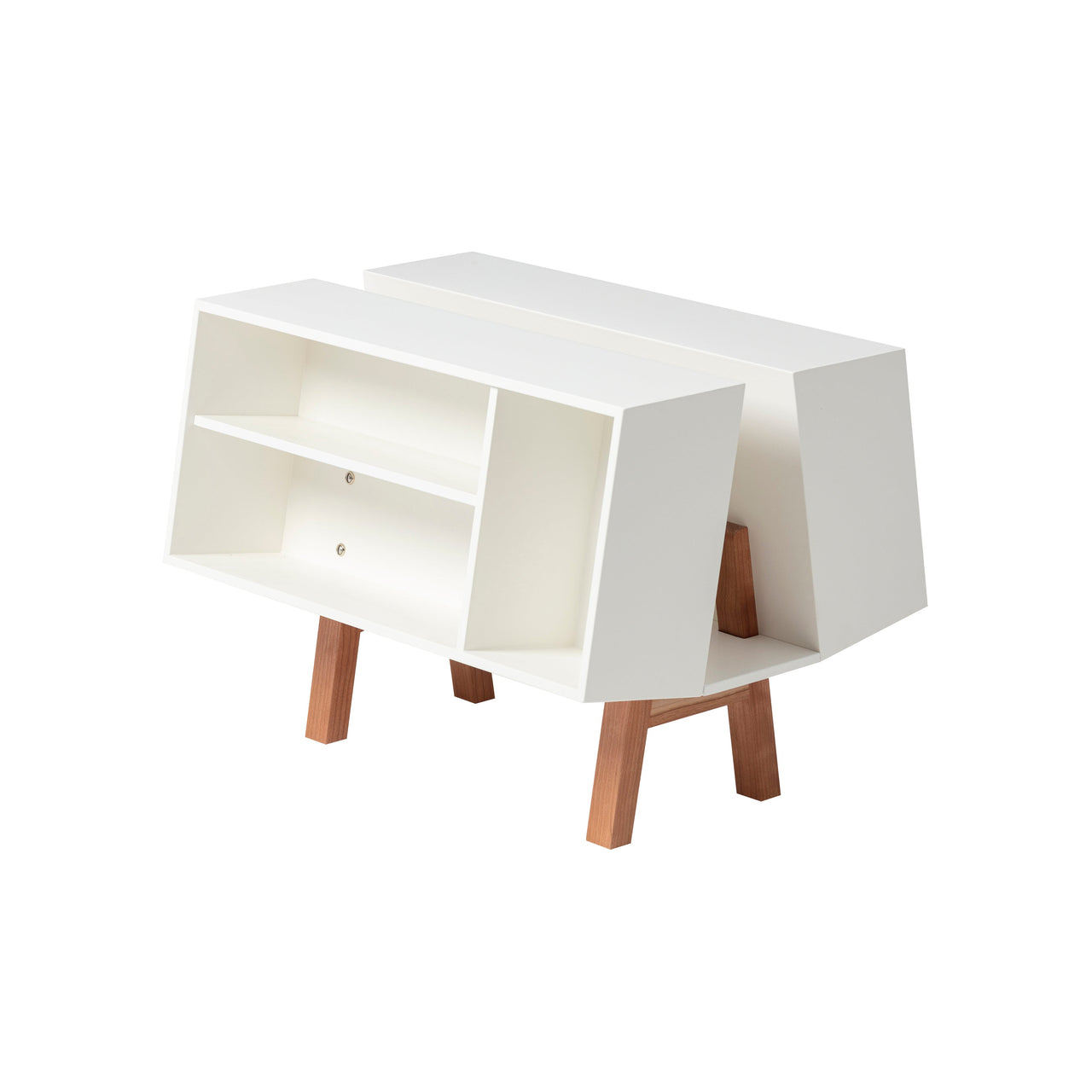 When Isokon commissioned designer Ernest Race to refashion the original 1939 Donkey in 1963, the result was advertised as an “obliging creature which holds up to 90 paperbacks…and provides a convenient chairside table.” Still handcrafted in London today, the clever double-bookcase structure features warm cherry wood legs and a white lacquered body.