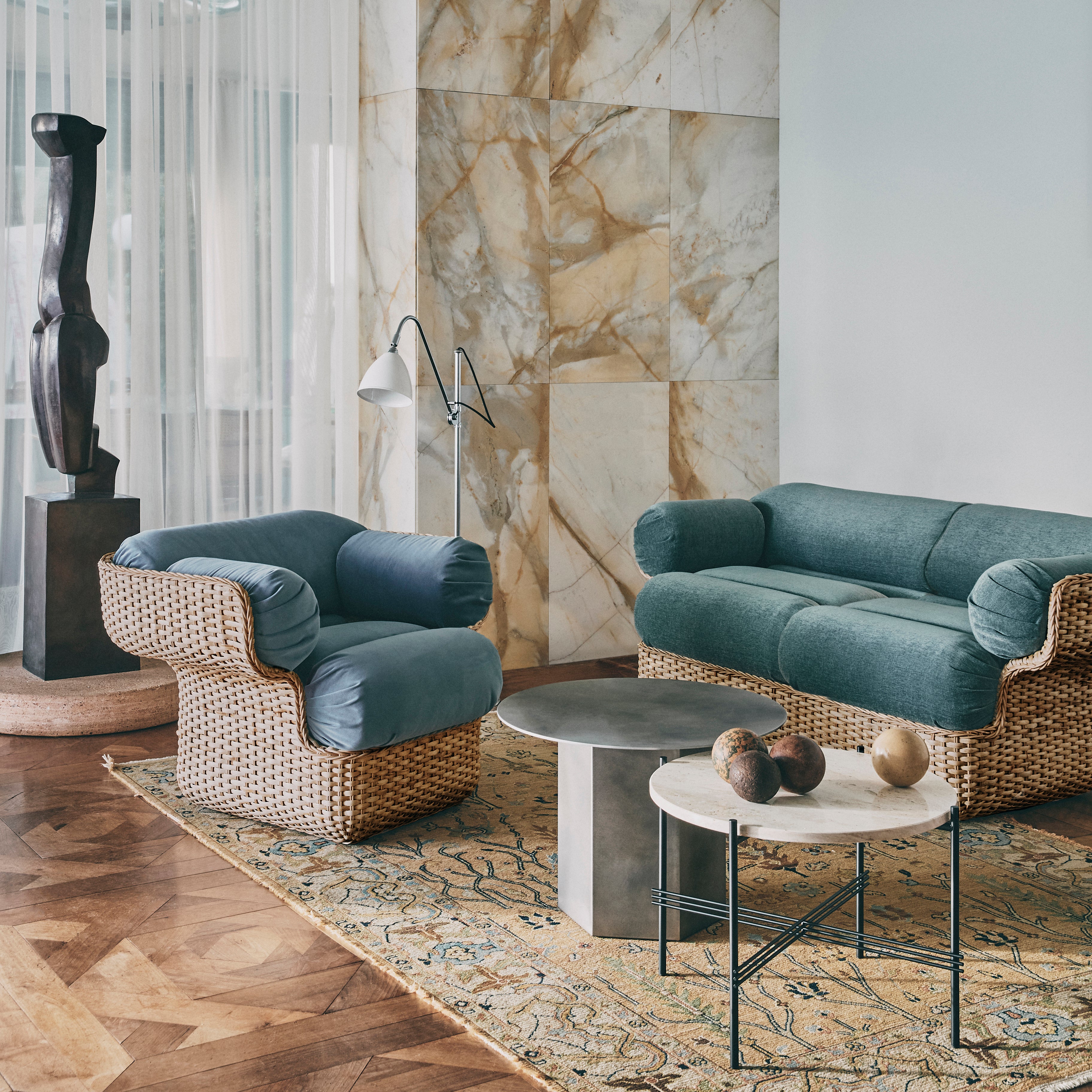 With its signature stepped silhouette and handwoven rattan surface, Italian design maestro Joe Colombo’s Basket series includes a cozily scaled 2 seater. Though best known for his futuristic plastic furniture, Colombo quite persuasively departed from form in this exceptionally well-crafted sofa, with its rattan “skin” placed over a skeleton made from environmentally responsible steel to give the piece strength and stability. Appealingly deep upholstered cushions exude a promise of comfort, with bespoke coverings available in a range of fine materials.