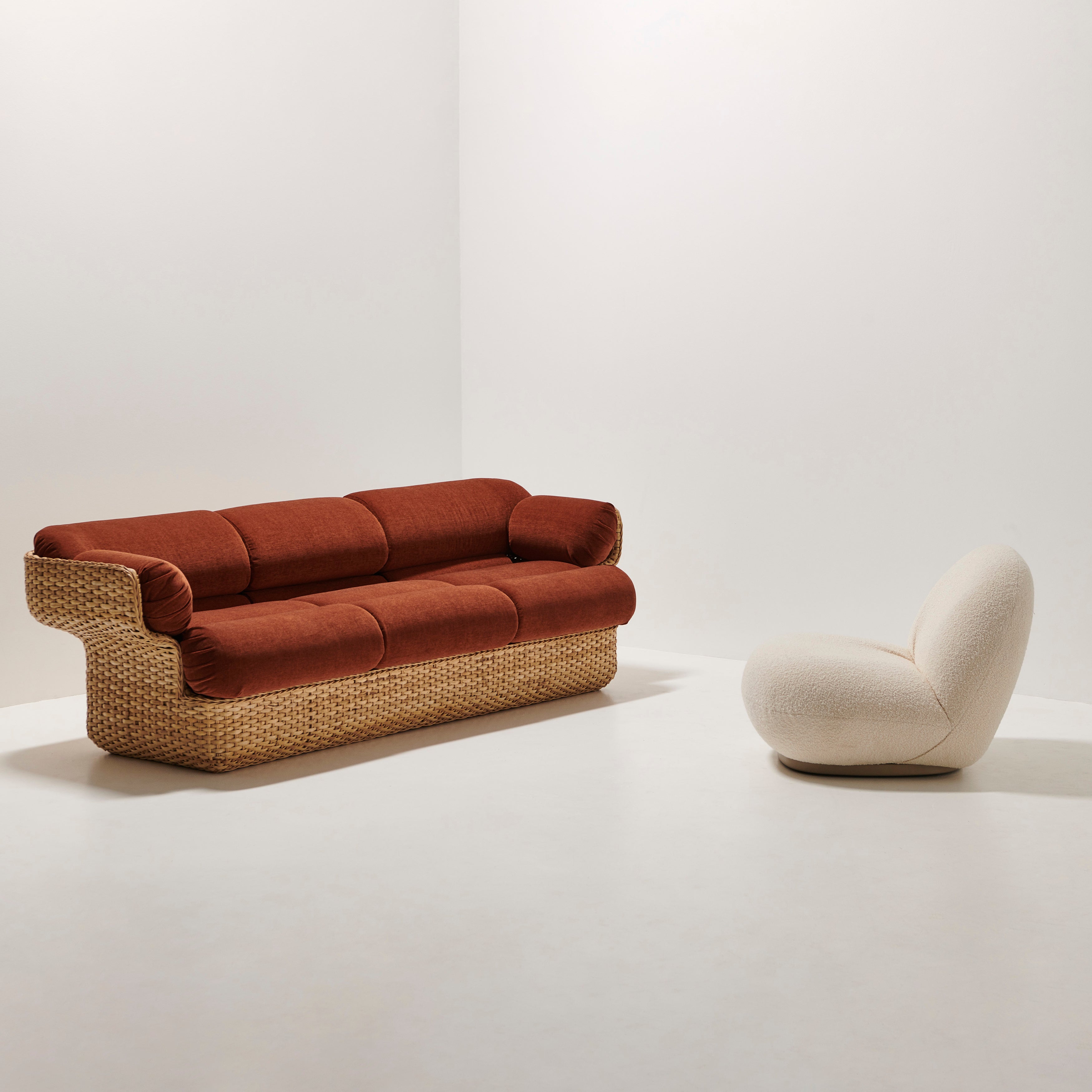 A spacious 3 seater fills out Gubi’s series first introduced by ‘60s Italian designer Joe Colombo in a turnabout from his futuristic plastic furniture. Basket retains his spirit of innovation but interpreted with an update on traditional hand-woven rattan and skillfully manipulated over the sofa structure made from environmentally responsible steel for strength and stability. Custom upholstery for the luxuriously deep cushions is available in a range of fine materials to complement the inviting sense of comfort.