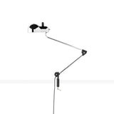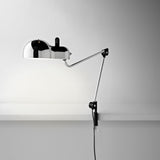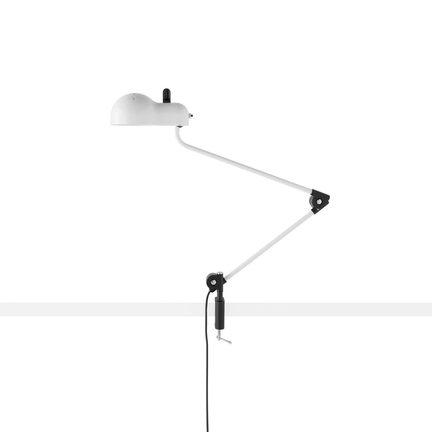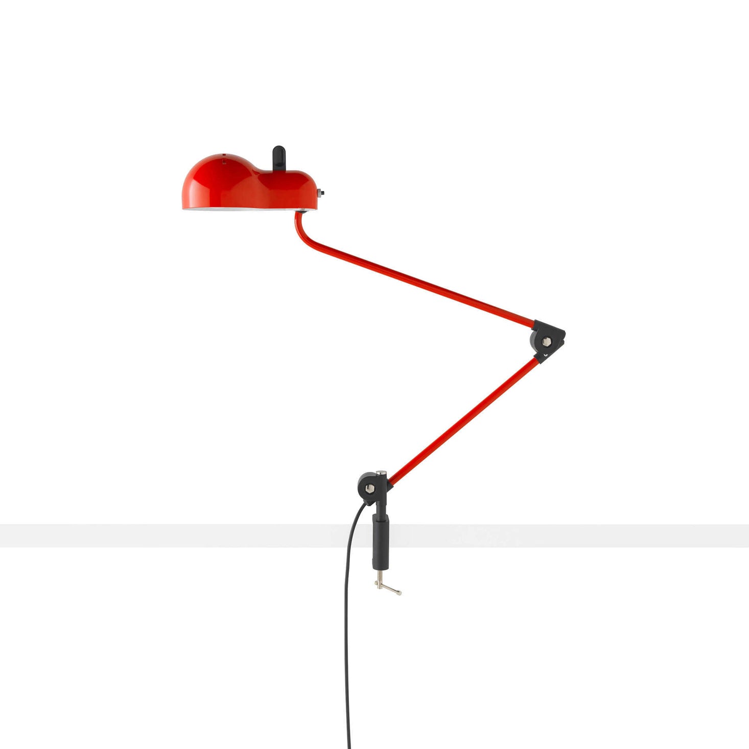 The Topo Table Lamp with clamp, designed by Joe Colombo in 1970, is inspired by automotive elements, featuring slits on its metal shell reminiscent of 1960s sports car vents. Its lampshade is shaped to fit a classic E27 bulb, while jointed metal arms and the adjustable clamp made of painted aluminum, providing flexibility in positioning. The lamp is available in finishes like glossy white, black, green, chrome, or iconic red. A black, heat-insulating handle enables easy adjustment.