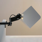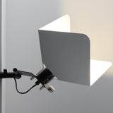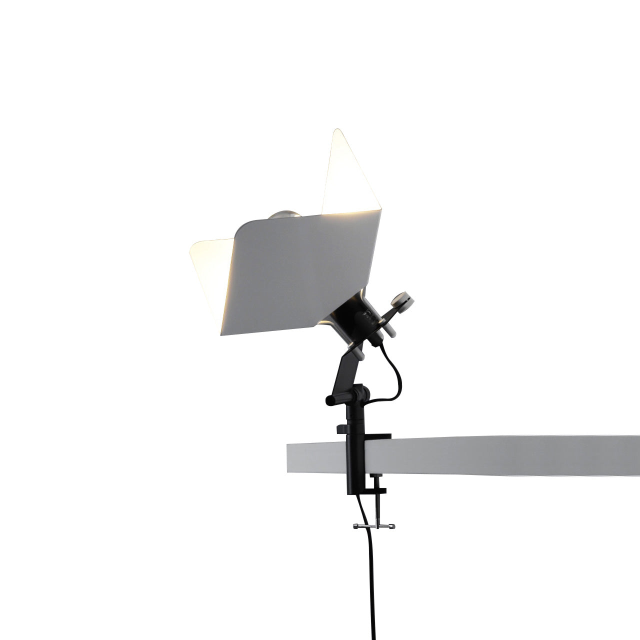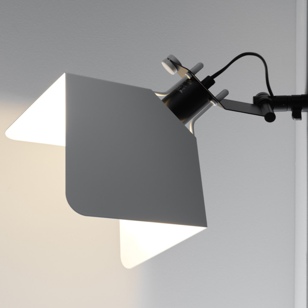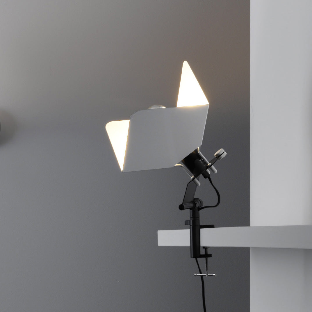 In a versatile clamp-on model for shelf or wall attachment, Triedro’s unique double-jointed arm offers flexibility to direct the illumination in any position as needed. Maestro Joe Colombo’s 1970 series endures, updated with a silver-domed LED bulb and gently reflecting inside the 3-part folded white metal shade without creating glare.