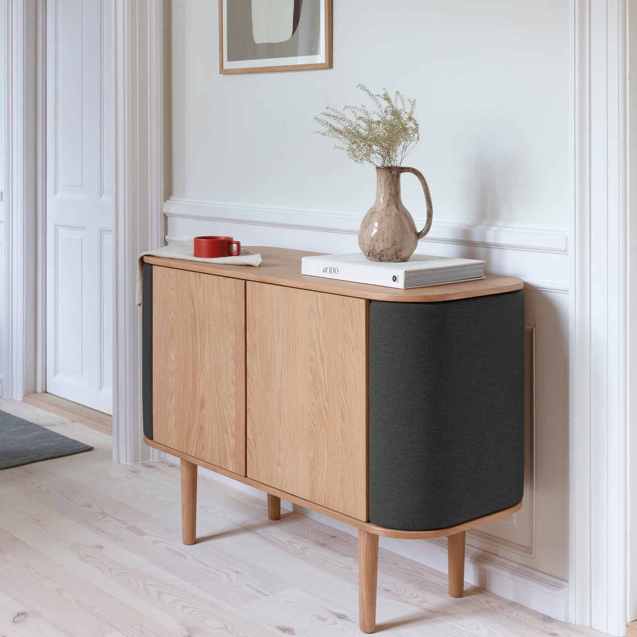 Designed in Denmark by Jonas Søndergaard, Treasures offers a number of attractive accent treatments to complement its veneered oak cabinetry. The sideboard's curving end doors can be customized in venetian cane, a chic textile or smooth leather as desired to harmonize with its intended setting. Additionally, the compartments swing open as wings, for readily storing liquor or glassware with easy access. The center enclosure, available with either 2 or 3 doors, also includes a single shelf for tidy organization.