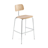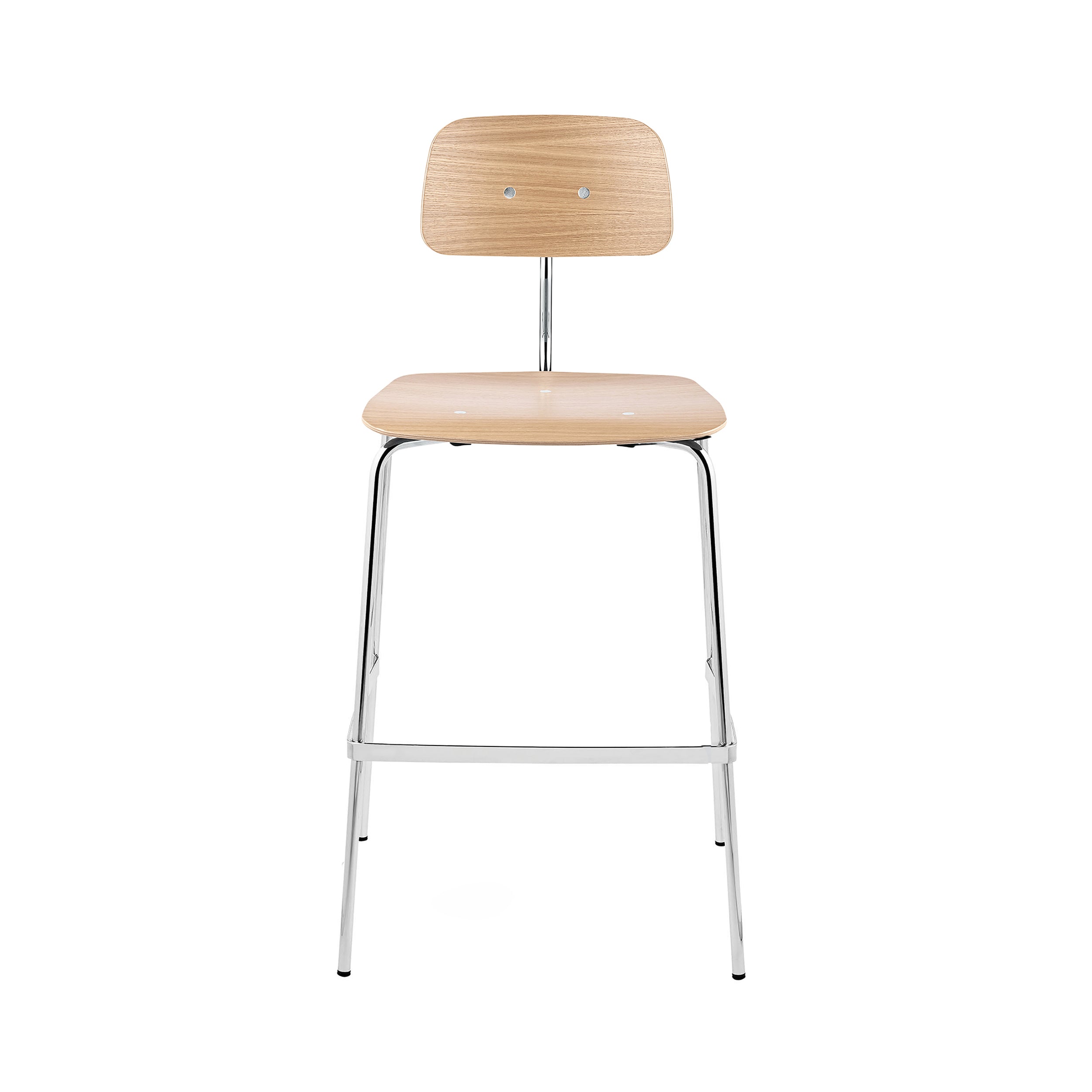 Kevi’s bar-height adaptation combines midcentury Danish heritage with convenient stackability up to 8 pieces high. Jørgen Rasmussen, who created the series’ original office chair in 1958, now adapts it in a high chair model with steel tubing legs finished in polished chrome or black powder coat. He retains the time-proven, compression-molded seat and back for extended comfort, in a choice of oak or walnut veneer as well as a selection of translucent lazure colors.