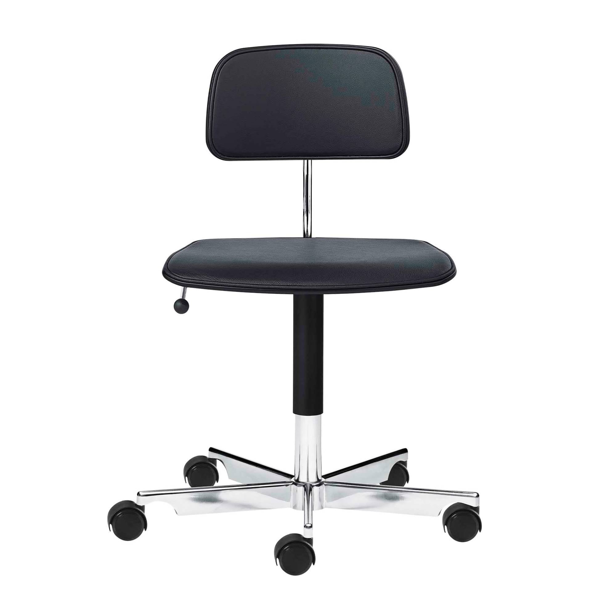 Front-facing upholstery customizes Kevi 2533, architect Jørgen Rasmussen’s timeless office original from 1958 that would become the rule in homes, schools and workplaces.  For counter and high work table seating, Size B employs his same rolling 5-star base in polished aluminium with height adjustment, optional tilt function and Rasmussen’s breakthrough double-wheel castors. Clad in a choice of premium fabric or leather, the  molded chair comes in oak or walnut veneer or colored lazure hues.