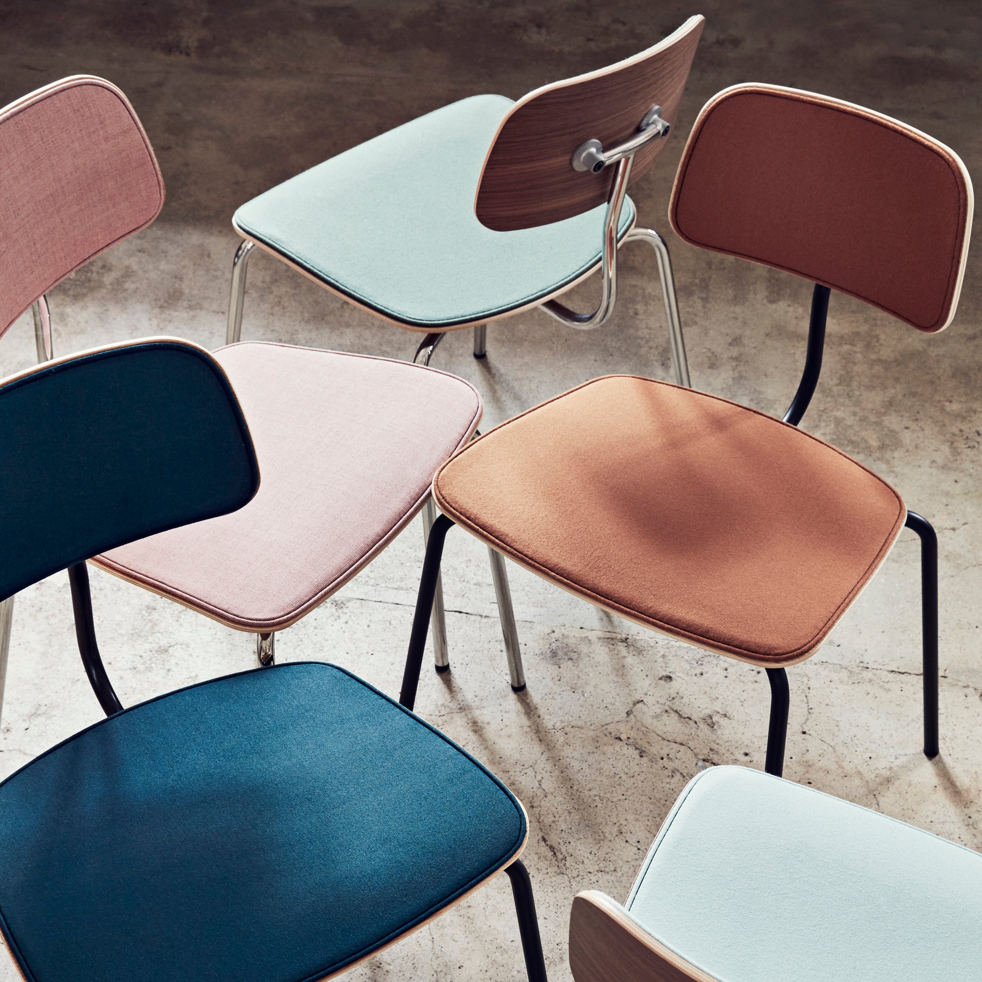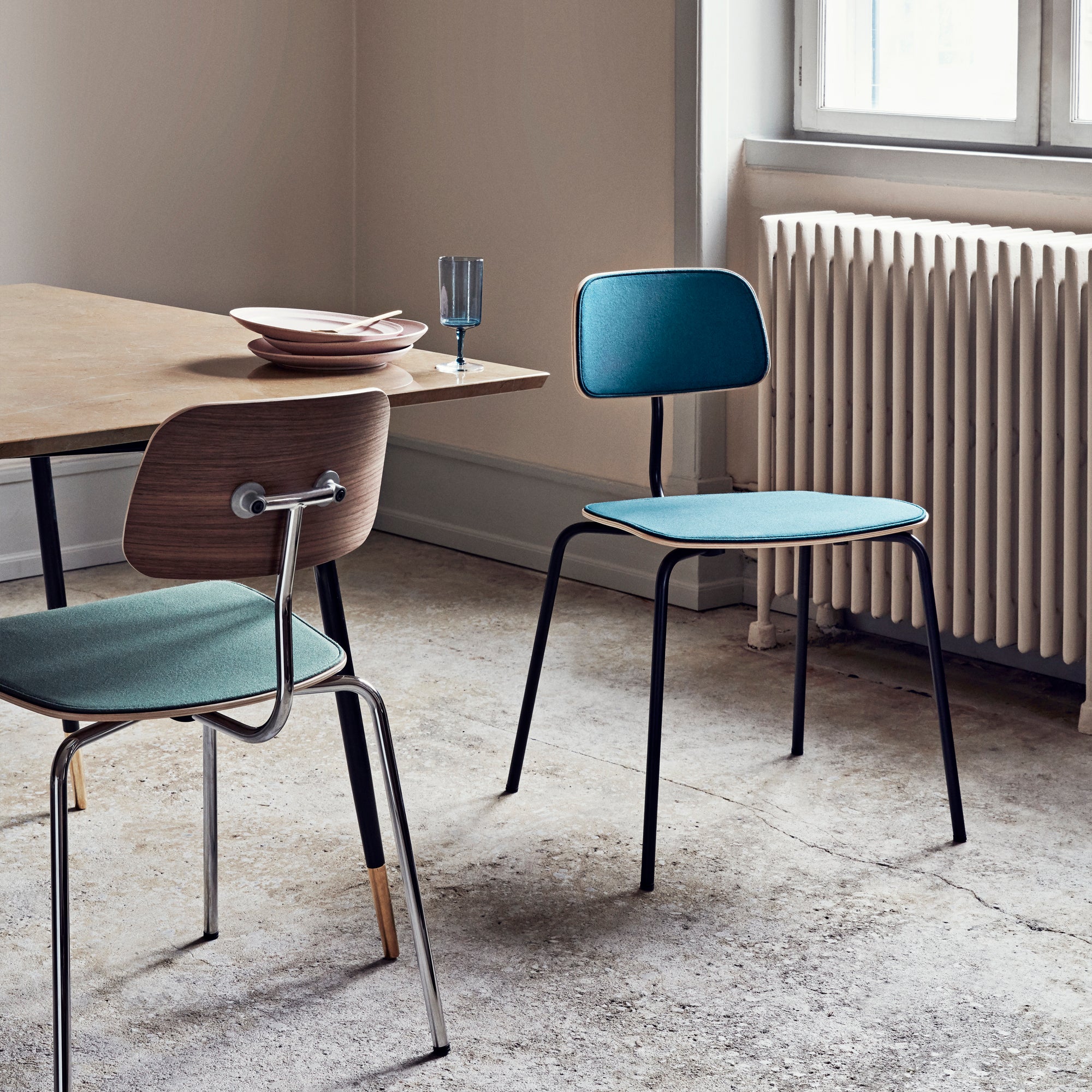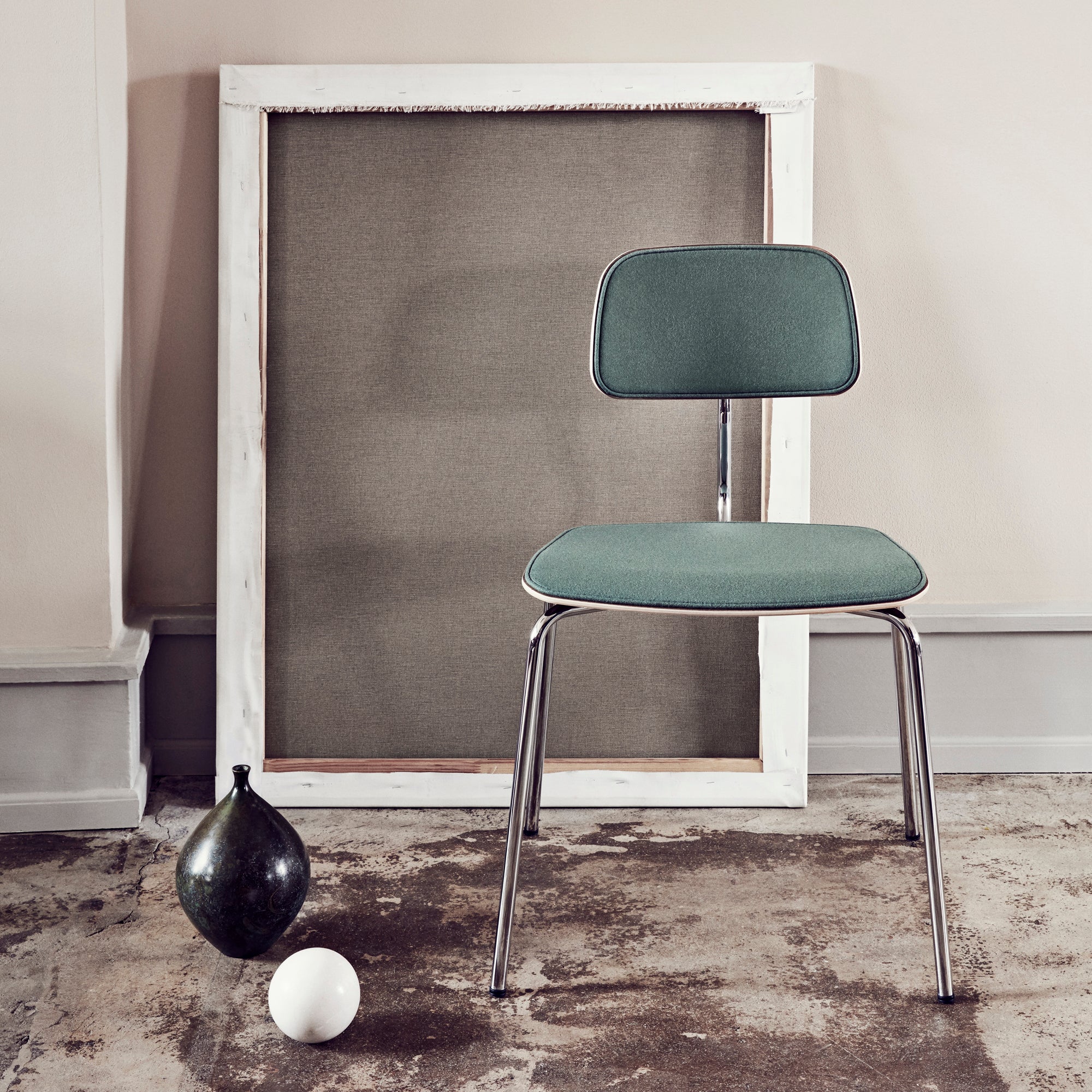 The option of an upholstered inset seat (with or without optional accompanying backrest front cladding) enhances designer Jørgen Rasmussen's variation on his classic Kevi office chair. This version 2060 replaces the central swivel with 4 steel tubing legs, finished in either polished chrome or black powder coat. Now produced by Copenhagen brand Engelbrechts, the chair still maintains the original's seat and back contours, based on Jørgen's belief that comfortable, supportive seating enhances the ability to get work done.