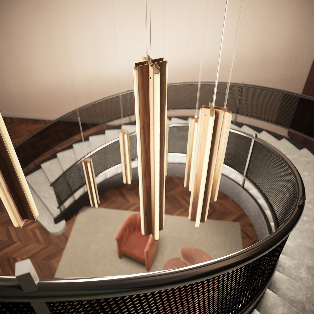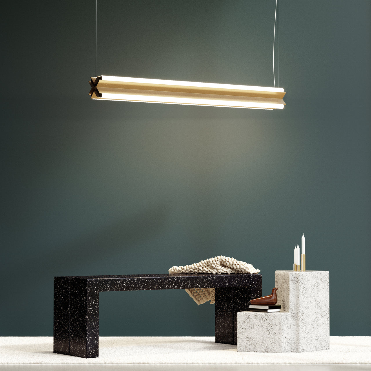 Axis X works all the angles. A structure of parallel L-shaped bronze segments creates 4 perpendicular arrays of light that radiate outward from its central channel. Designed by Miren Lasnier of Brooklyn-based Juniper Designs, the suspended LED fixture can be oriented as either an X or cross (+) shape on-site. With original inspiration drawn from geometric forms dating to the industrial revolution, this modern take brings a luxe interpretation that is much more than merely functional.