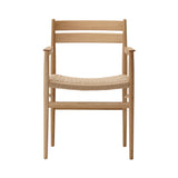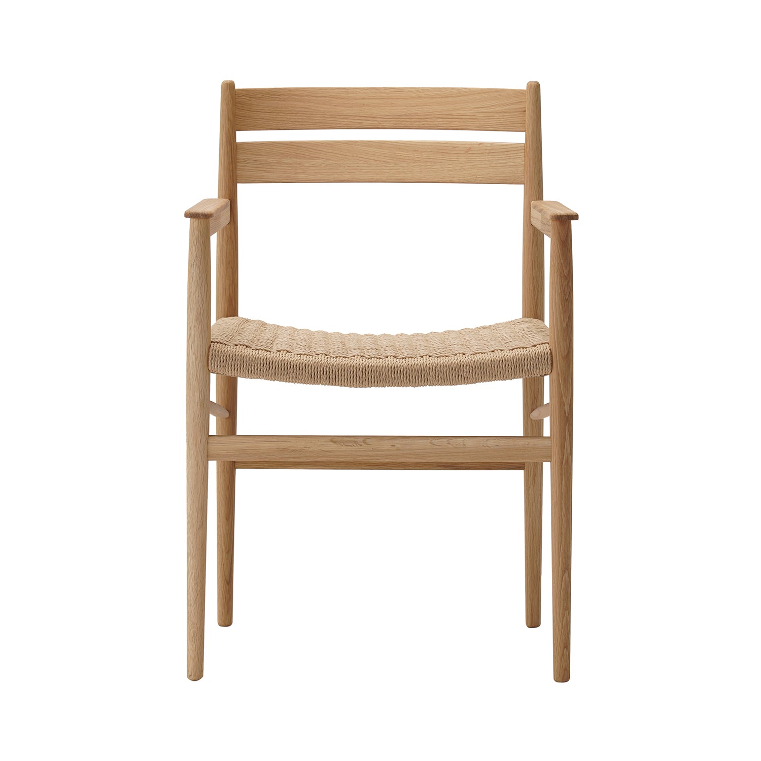 The Hiroo Dining Chair N-DC04, designed by Norm Architects, is a simple expression of straightforward, functional seating design executed with exceptional woodworking. Its structure, primarily composed of straight elements, is subtly contrasted by a single angled stretcher. The N-DC04 features armrests and the seat variation, woven from durable paper cord, offers a natural texture and comfortable support. Crafted from premium oak, available in finishes smoked oak, pure oak, grain matte black, and keyaki brown.