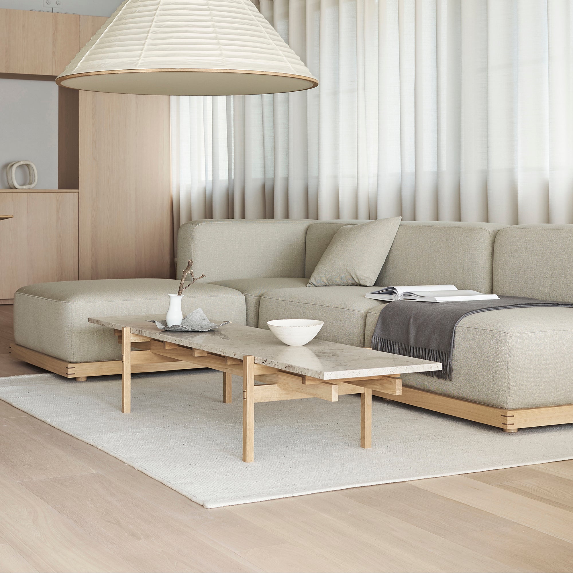 The varied wood planes of this elongated coffee table echo the facades and doors found in Japanese shrine and temple architecture. From that inspiration, Copenhagen's Norm Architects configures Kinuta's horizontal elements with precise spacing, to arrive at an airy base configuration that allows light to pass through. In contrast, the solid marble tabletop is a masterstroke of high visual impact in the best minimalist tradition.