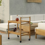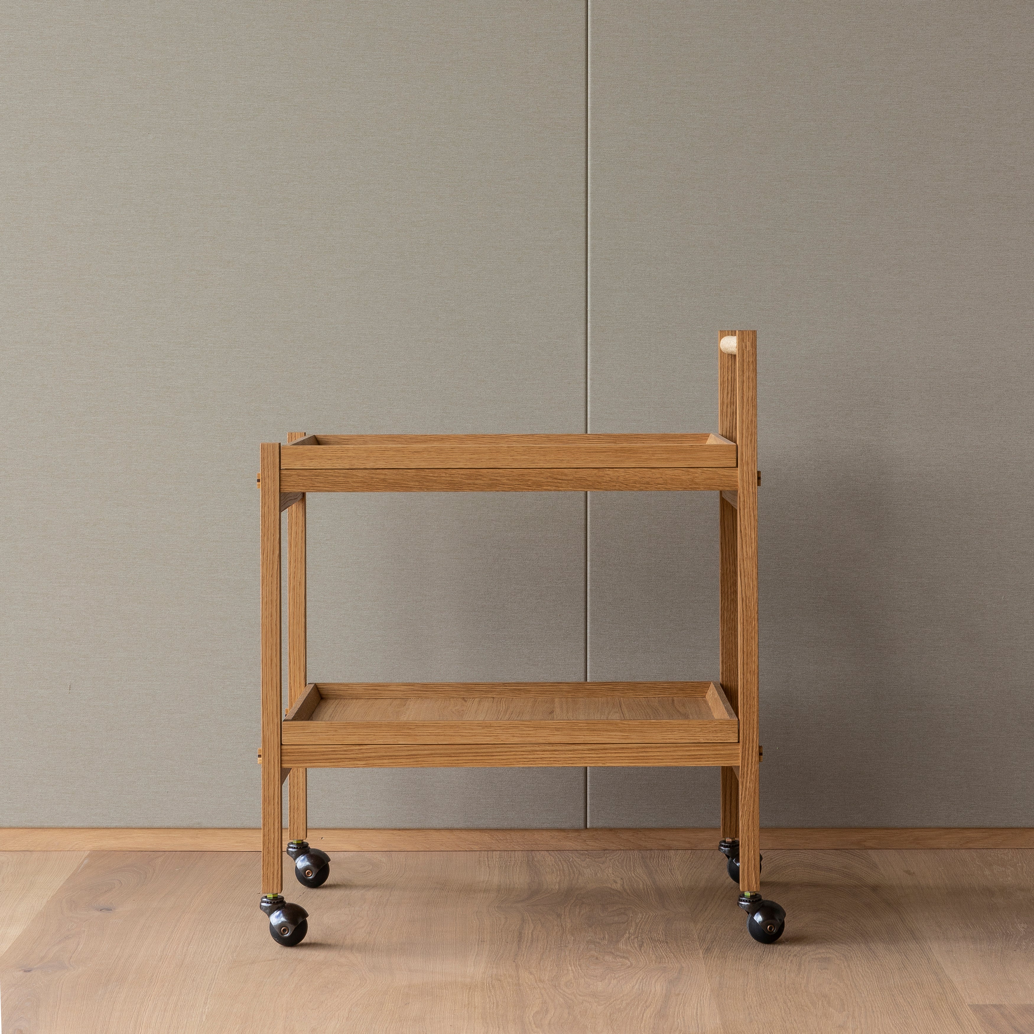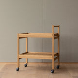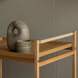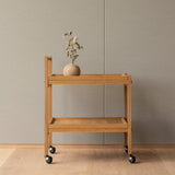 Exploring the similarities between Eastern and Scandinavian aesthetic expression, Norm Architect’s rolling oak cart was partially inspired by umbrella and shoe racks seen by the entrance of Japanese temples and shrines. With construction that resembles those shelving systems and joinery detail in a contrast wood hue, Karimoku Case's double-shelf N-T01 also features a handle covered in paper braid for a tactile fillip.
