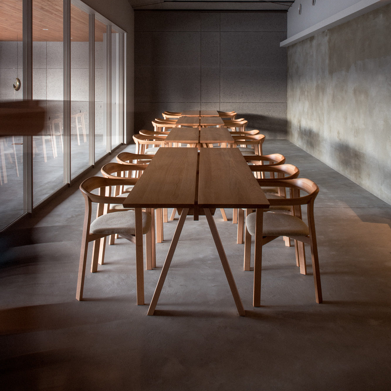 First conceived when a group of the designers gathered for an intensive design workshop that took place in the small town of Morodomi in southern Japan, the expanded collection employs tactile natural materials and rich finishes. Superbly crafted furnishings are fashioned in oak, ash, hinoki and cedar woods; buttery leather; paper cord and fine upholstery fabrics; as well as unique Japanese-inflected finishes. Each piece is crafted in Morodomi, from Mowat’s Aiizome storage cabinet painted with sumi ink, red dye and two shades of Japanese indigo, to Ashizawa’s evocative plumply cushioned Raft platform sofa, to Anderssen & Voll’s sculpted-wood Blest side chair with its curved back reminiscent of a sail.