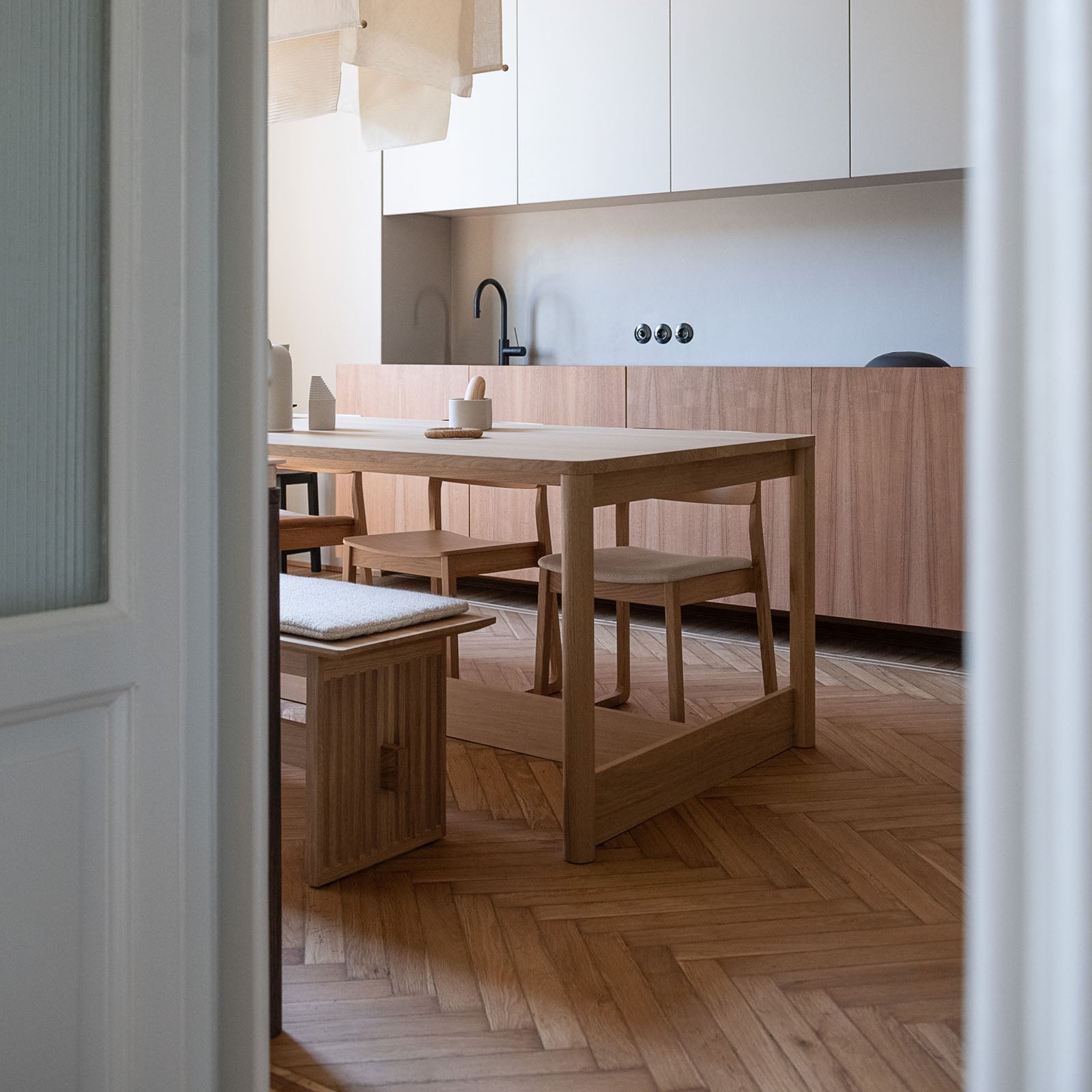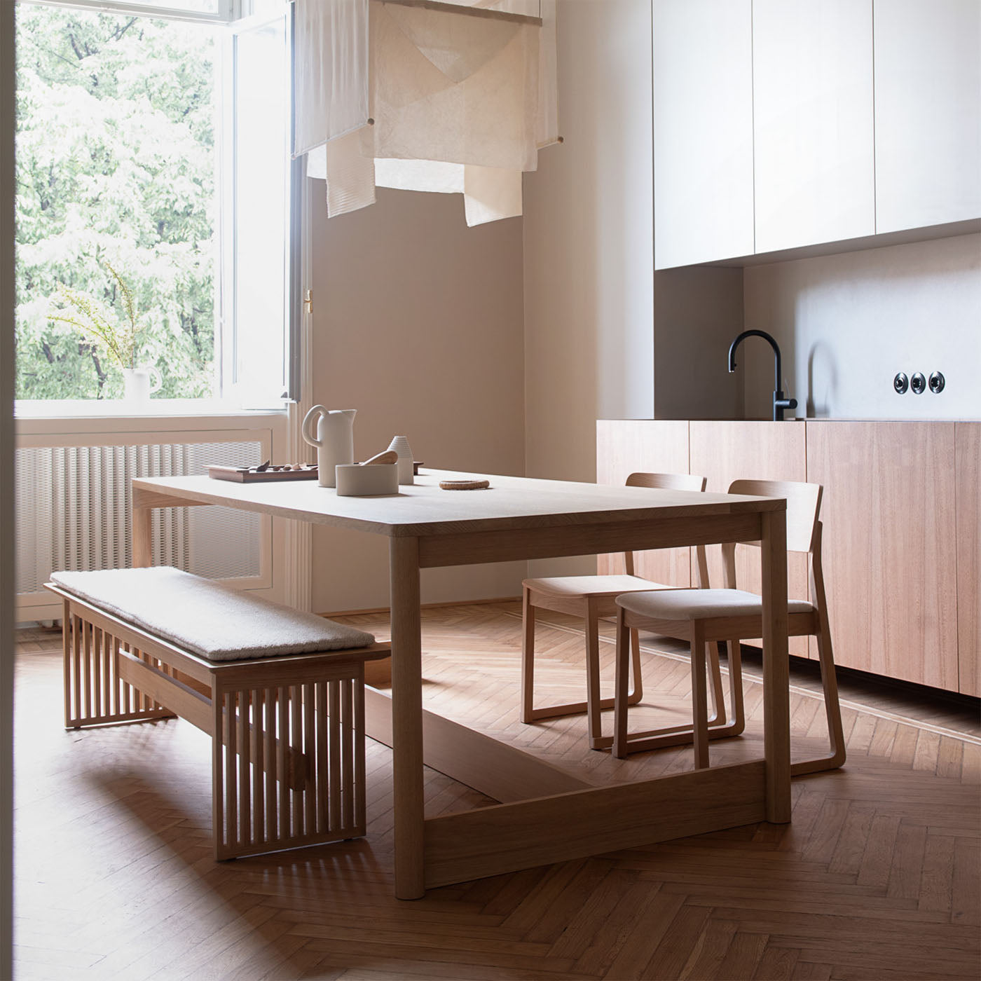 First conceived when a group of the designers gathered for an intensive design workshop that took place in the small town of Morodomi in southern Japan, the expanded collection employs tactile natural materials and rich finishes. Superbly crafted furnishings are fashioned in oak, ash, hinoki and cedar woods; buttery leather; paper cord and fine upholstery fabrics; as well as unique Japanese-inflected finishes. Each piece is crafted in Morodomi, from Mowat’s Aiizome storage cabinet painted with sumi ink, red dye and two shades of Japanese indigo, to Ashizawa’s evocative plumply cushioned Raft platform sofa, to Anderssen & Voll’s sculpted-wood Blest side chair with its curved back reminiscent of a sail.