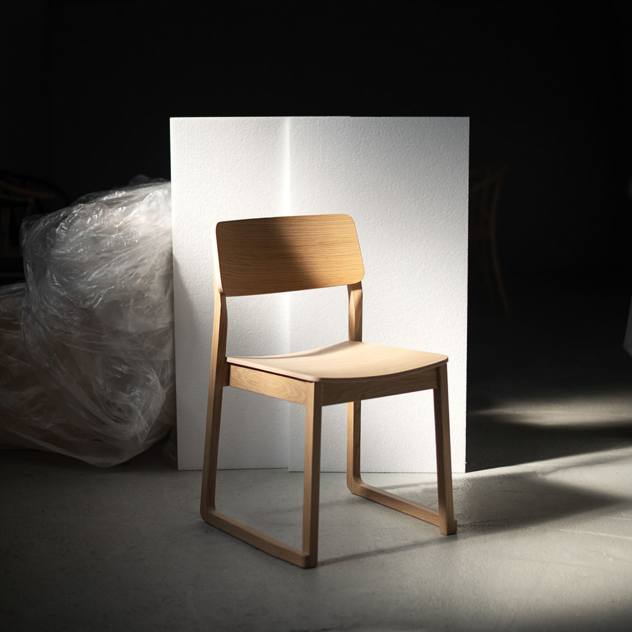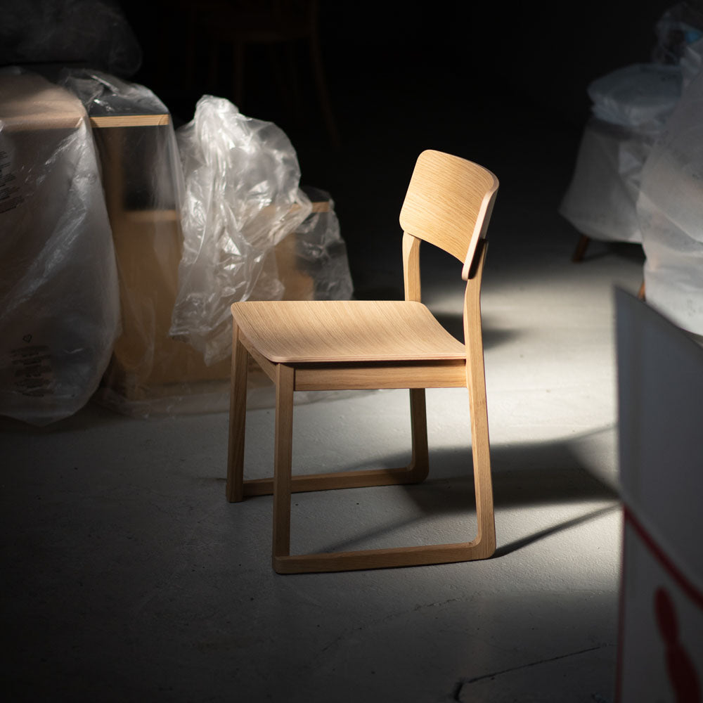 The Sori Chair by Ariake features a smooth bridge connecting the front and back legs, making it ideal for use on carpets and tatami floors. Its name, "Sori," refers to its sled-like details. The chair is stackable and crafted to appear as a single, fluid stroke from the backrest. Available in 2 sizes.