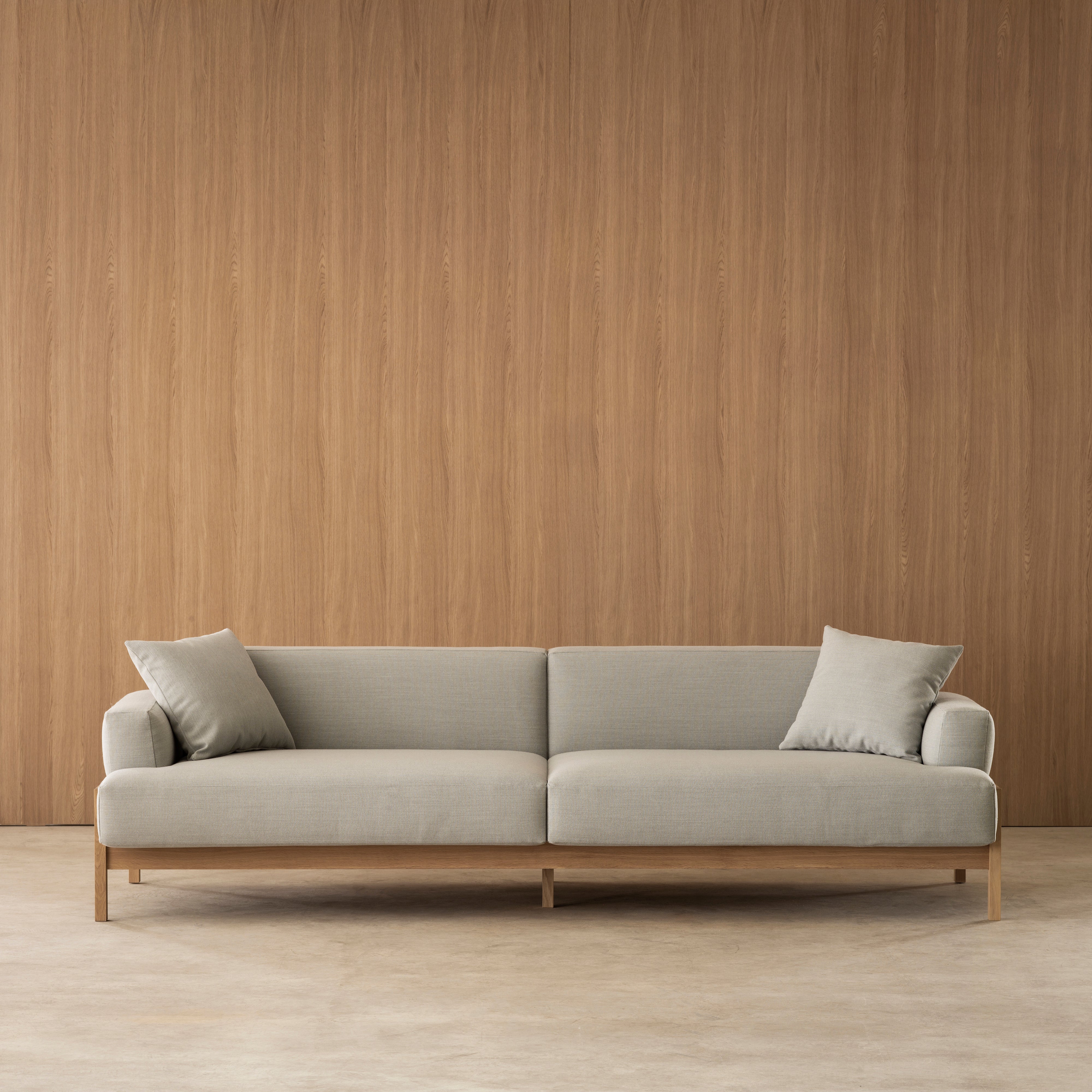 Simple, yet beautifully detailed, this wood-framed standard sofa is one of 12 tailormade furniture pieces that were initially designed for the renovation of Tokyo's '80s-era, courtyard-facing Kinuta Terrace apartments. In collaboration with Copenhagen's Norm Architects, Karimoku Case's seating emphasizes the connection with nature outside. With its warm oak structure, the sofa's low height plays up the surrounding space and the armrest can also be used as a pillow, making it a daybed.