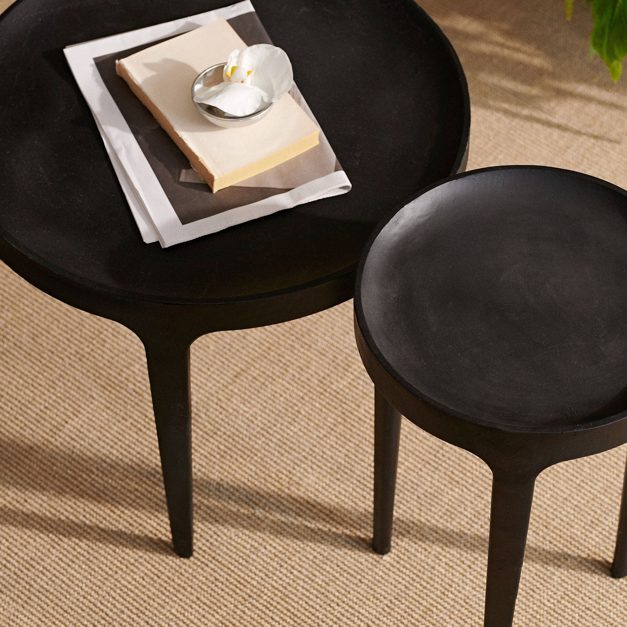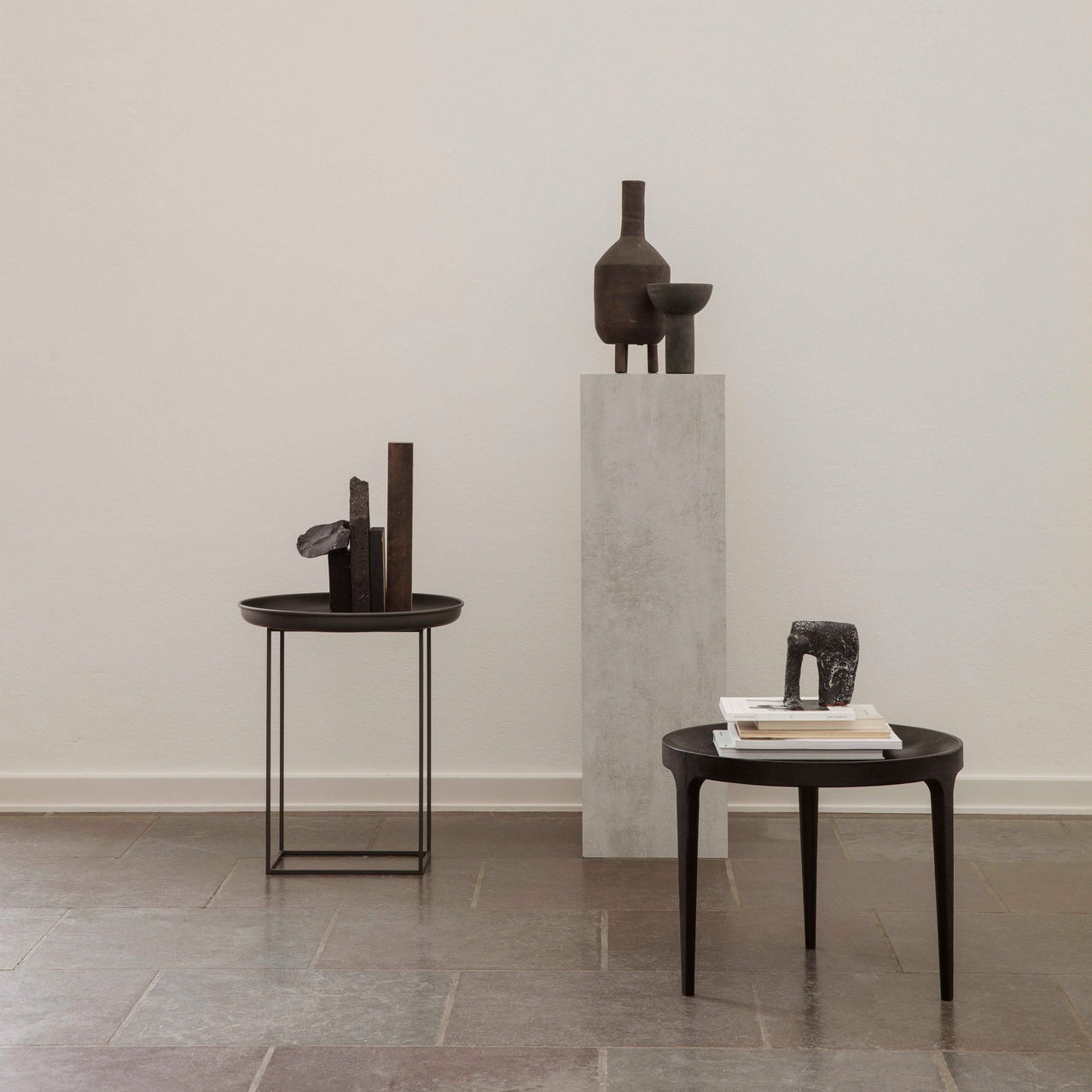 The Ghost Coffee Table stands out with its raw, industrial aesthetic. Cast from aluminum, the table retains the rugged, tactile feel of its mold, resulting in an unpolished, almost primal texture that makes each piece truly unique. Its three-legged structure is both sturdy and elegantly minimalist, with a distinct groove running along the tabletop edge, adding subtle detail. Finished in a deep black powder coating.