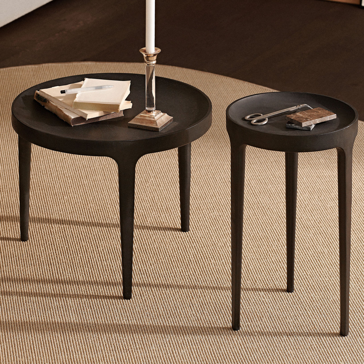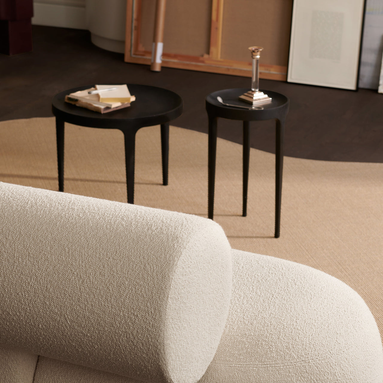 The Ghost Side Table stands out with its raw, industrial aesthetic. Cast from aluminum, the table retains the rugged, tactile feel of its mold, resulting in an unpolished, almost primal texture that makes each piece truly unique. Its three-legged structure is both sturdy and elegantly minimalist, with a distinct groove running along the tabletop edge, adding subtle detail. Finished in a deep black powder coating.