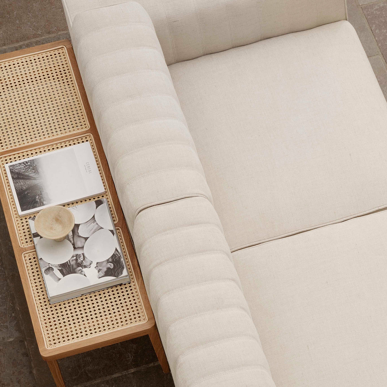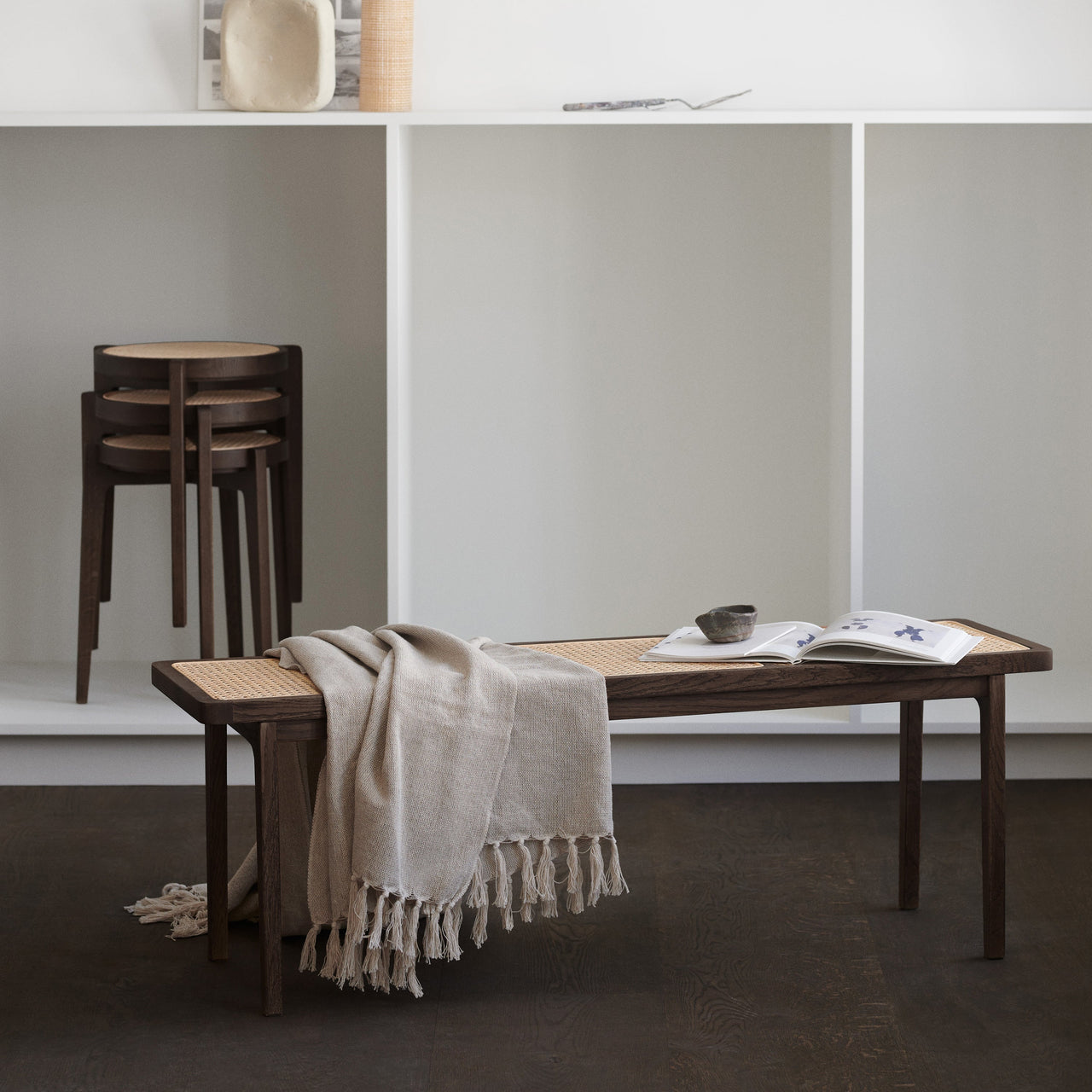 The Le Roi Bench is crafted from solid ash wood with inlaid natural French rattan. It combines the elegance of French colonial furniture with minimal Scandinavian design. Designed by Kristian Sofus Hansen and Tommy Hyldahl, the bench serves as both a seating option and a coffee table. It can hold up to 200 kg and is available in natural or dark smoked ash.