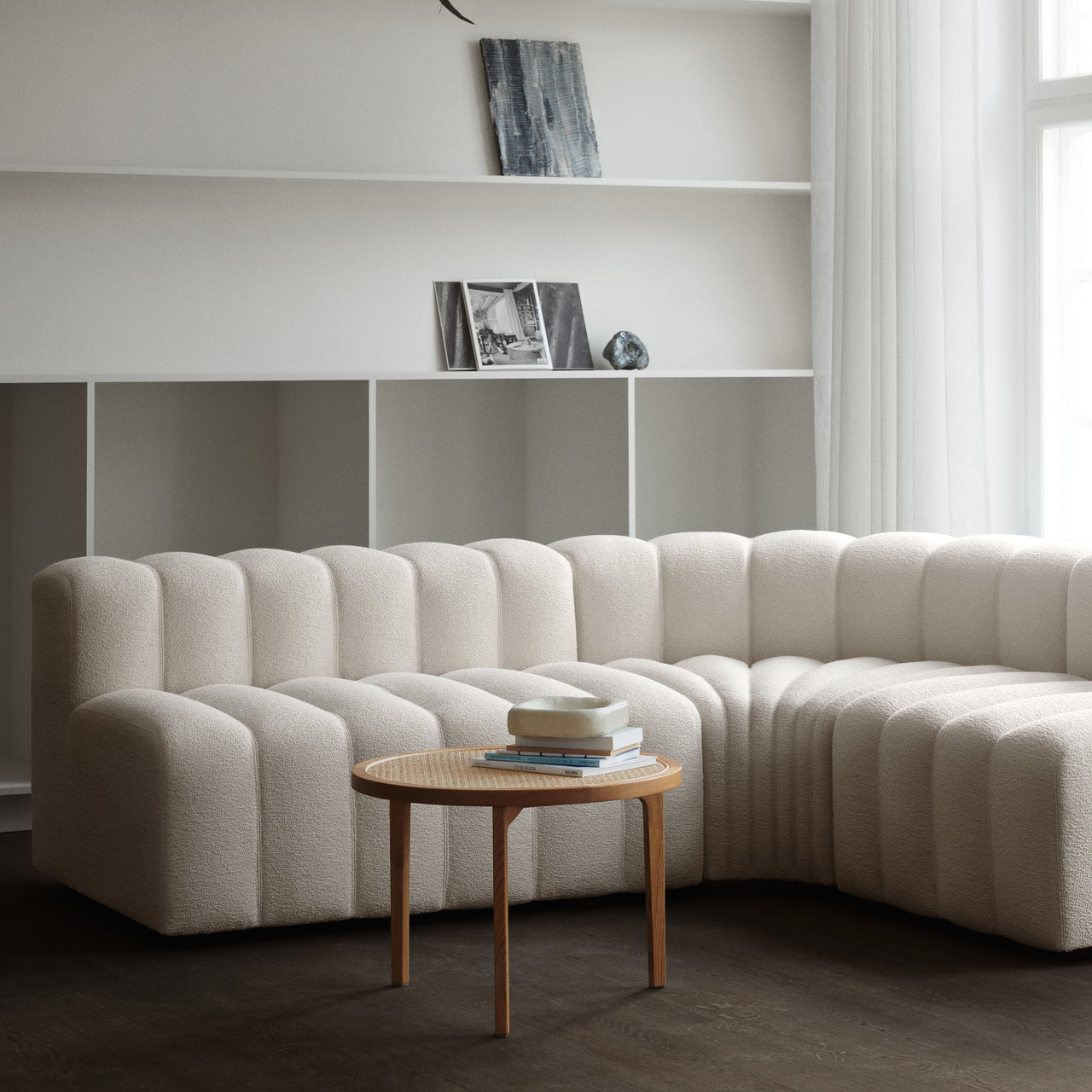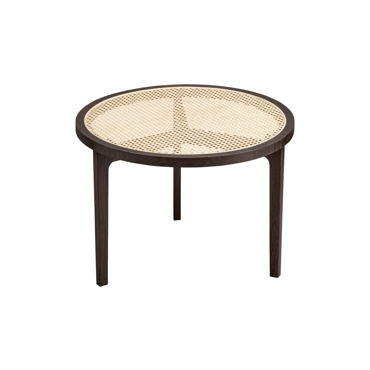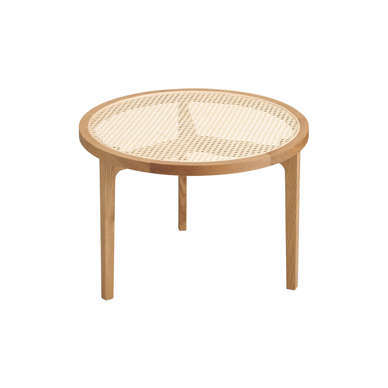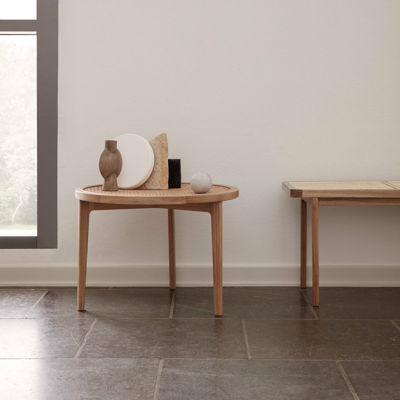 The Le Roi Coffee Table by Norr11 is constructed from solid ash with handwoven natural French rattan. Its compact size and round table top makes it versatile. The design features a frame geometry inspired by Scandinavian furniture and traditional French rattan craftsmanship. Created by designers Kristian Sofus Hansen and Tommy Hyldahl, the table is available in natural or dark smoked ash finishes.