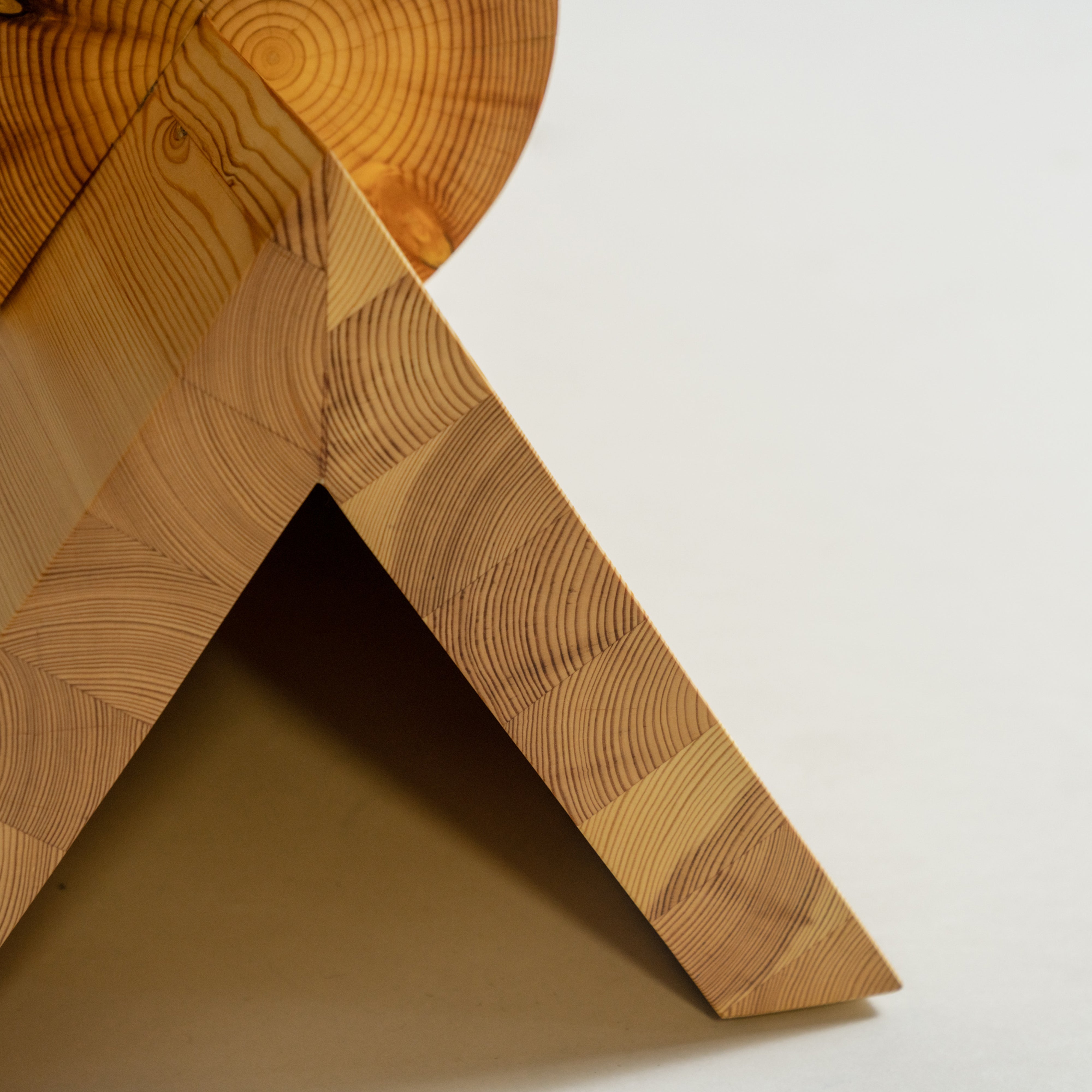 The 006 AA Bench, designed by Kwangho Lee, has a full pine log running through the middle, supported by a slatted seat and inverted V-shaped legs. Though the structure appears simple, it requires considerable carpentry expertise to join the hefty elements. Over time, the wood’s natural oils and resins will cause it to develop a warm honey tone, with dents and scratches adding character.