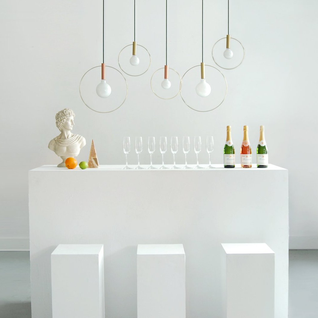 In a breathtaking display, Ladies & Gentlemen studio configures a 5-piece row of its foundational Aura. A signature of the minimalist brand, each individual pendant is an exquisitely simple union of pristine bulb and surrounding metal ring, available in brass, copper or blackened metal. Grouping 2 of the larger versions and 3 of the smaller, the lineup stems from a single ceiling canopy, with the installation height and rotation adjustable up to 8 feet.
