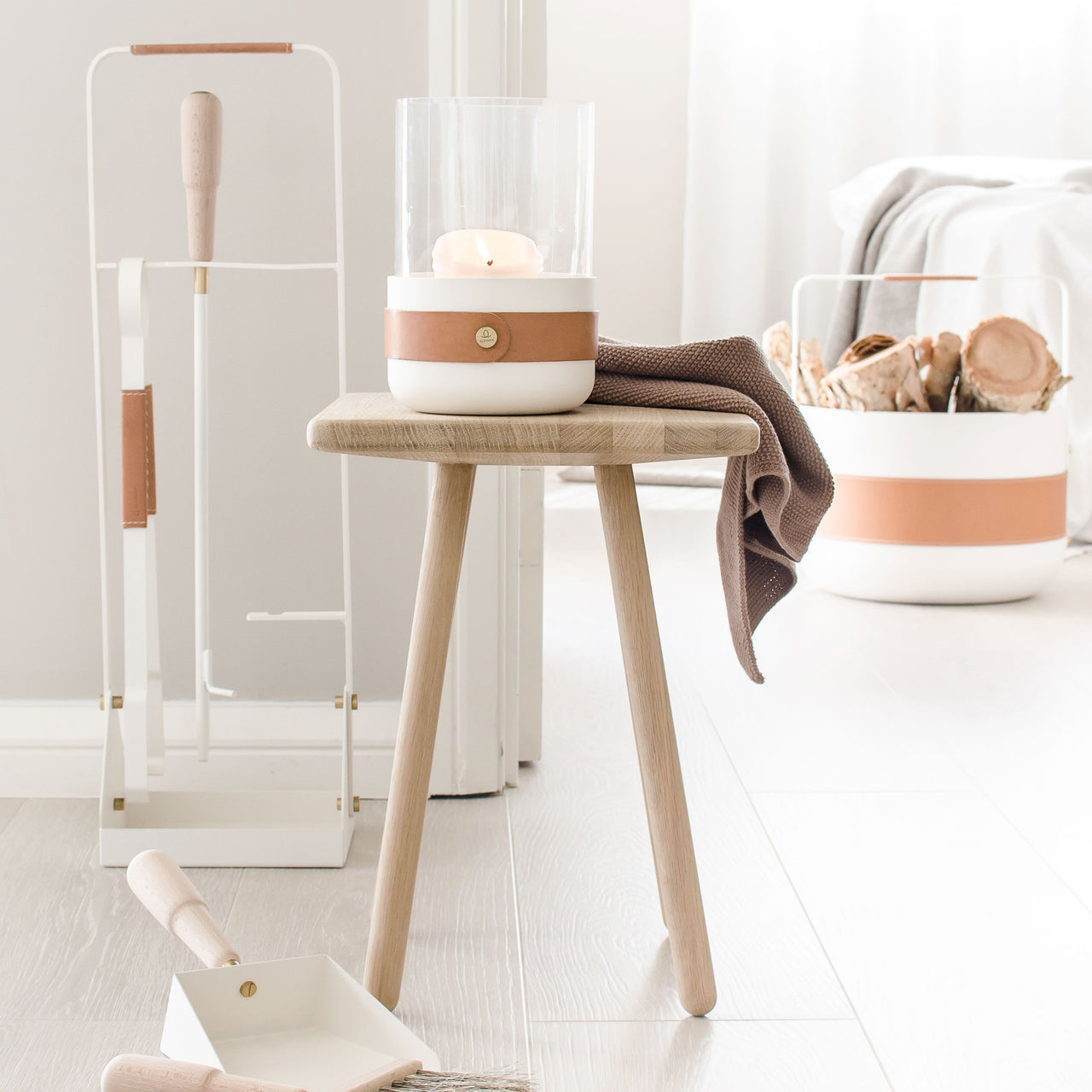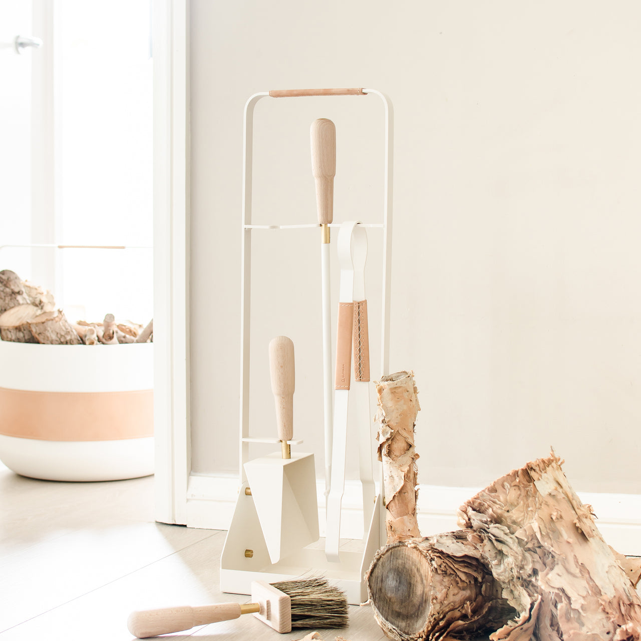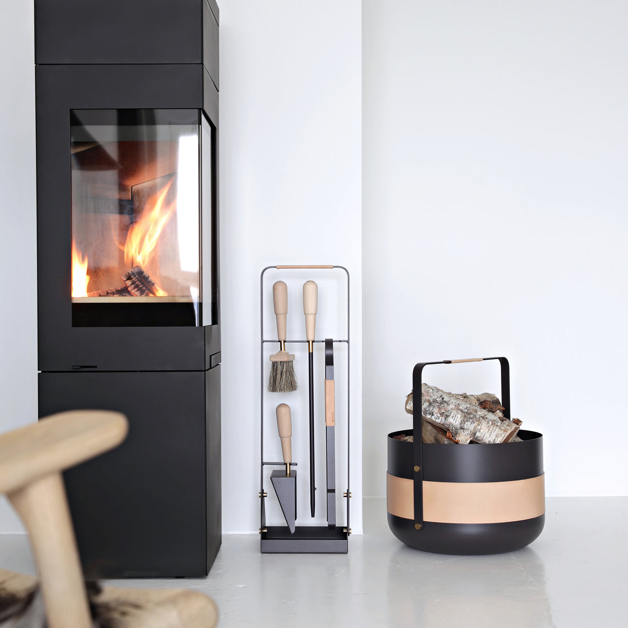 Set includes: tongs, brush, shovel, blow poker (can be used as both blower and poker) Beech wood harvested from sustainable forests in France. Brush uses 50% horse hair, 50% tampico, which is made from the roots of the agave cactus. This gives the brush more stiffness and improves heat resistance. Horse hair and natural, vegetable tanned leather from Swedish tannery Tärnsjö. Tongs in Naturel I, Naturel II and Havane sets include Tärnsjö leather handles.