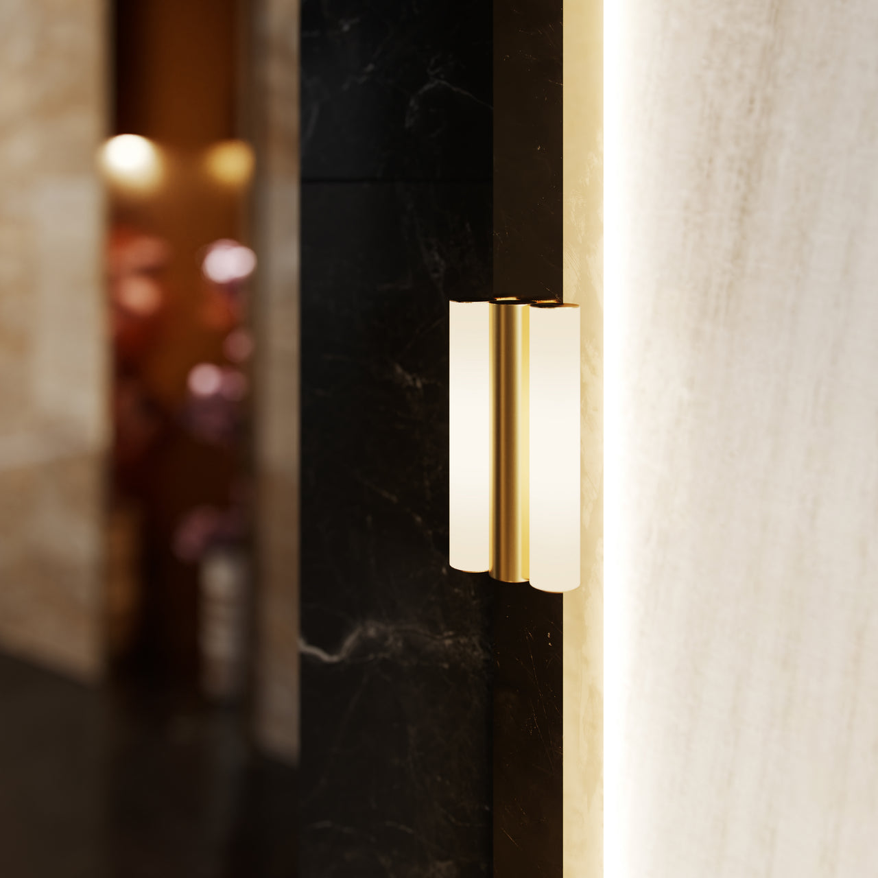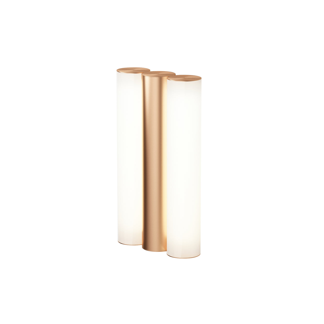 With Art Deco overtones, Gamma consists of a luminous opal cylinder bracketed by similarly sized metal tubes. Personalization comes in the wide choice of available metals—brass, nickel, cooper or graphite—each with either a polished or matte finish. Belgium-based designer Sylvain Willenz has adapted his tubular scheme as the basis for an entire collection, including a grand circular chandelier and linear suspension lights.