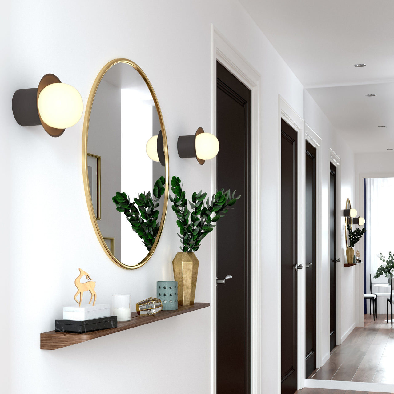 A saucer-like backplate reflects the light from Janed’s glowing opaline sphere in a smaller version to deploy singly or in multiples. In solid brass, CVL’s wall lamp is handcrafted in France with a range of luxurious metal finishes to mix or match for the mount and reflector. Designer Émilie Cathelineau completes the wall fixture with the milky mouth-blown globe to gently diffuse its warm LED illumination.