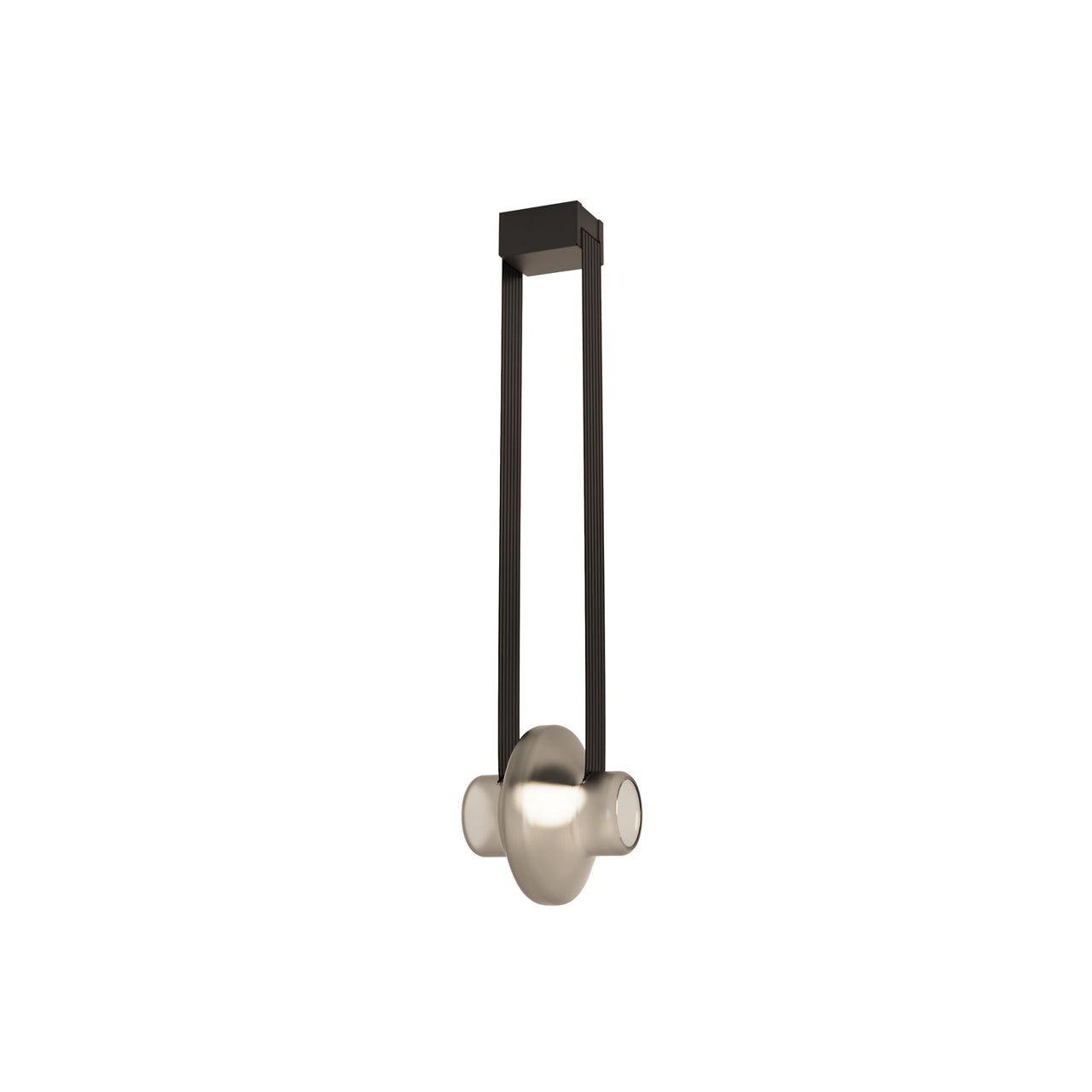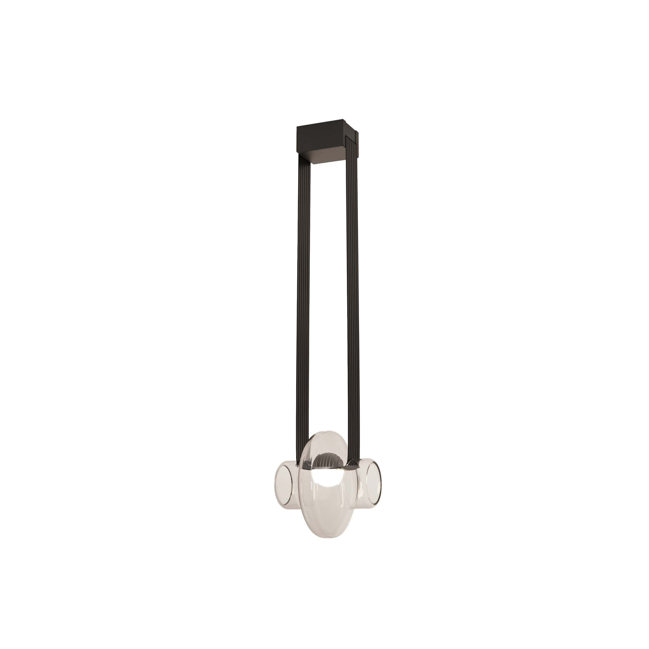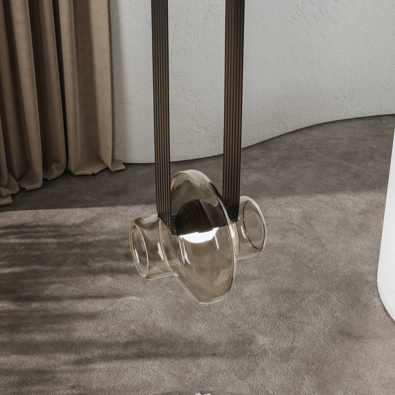 A contemporary lighting system inspired by scenic mountain landscapes and their reflections. It features a wide, flexible, conductive cable that supports and powers the light modules, allowing for versatile configurations. The cable is finished in matte black and designed for creating various geometric and tension-based setups. The lamp includes hand-blown glass globes available in transparent, pink, gray, and amber, with options for clear or frosted finishes. The anodized aluminum and frosted glass light module can direct light either downward or upward.