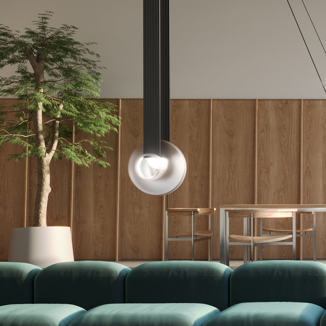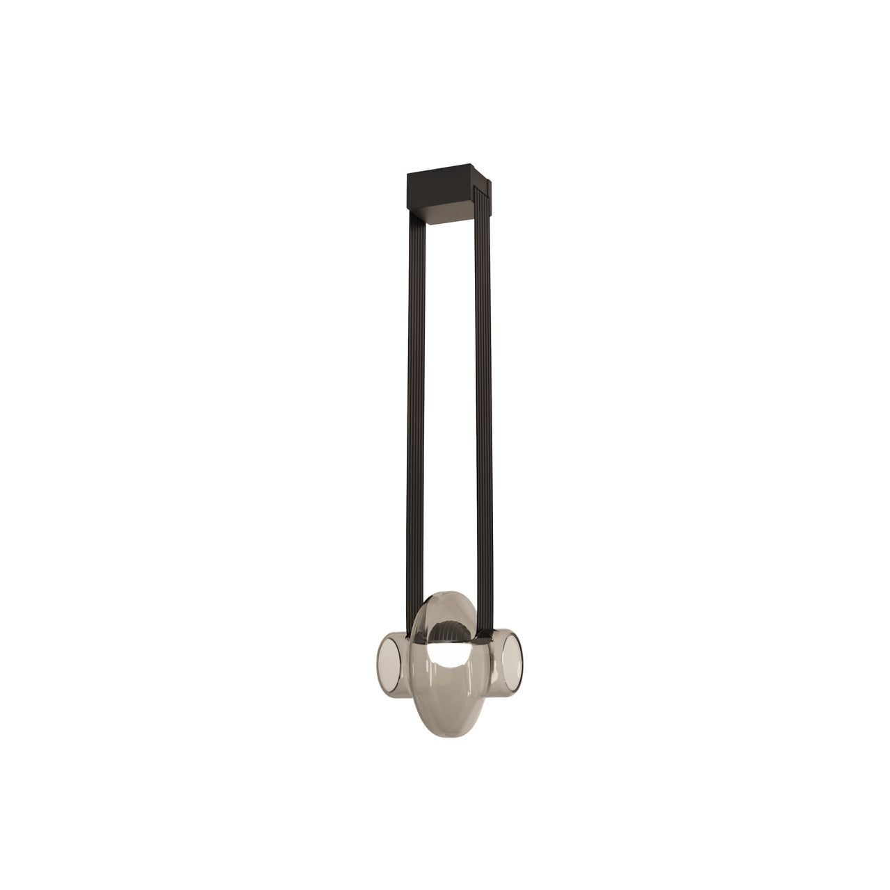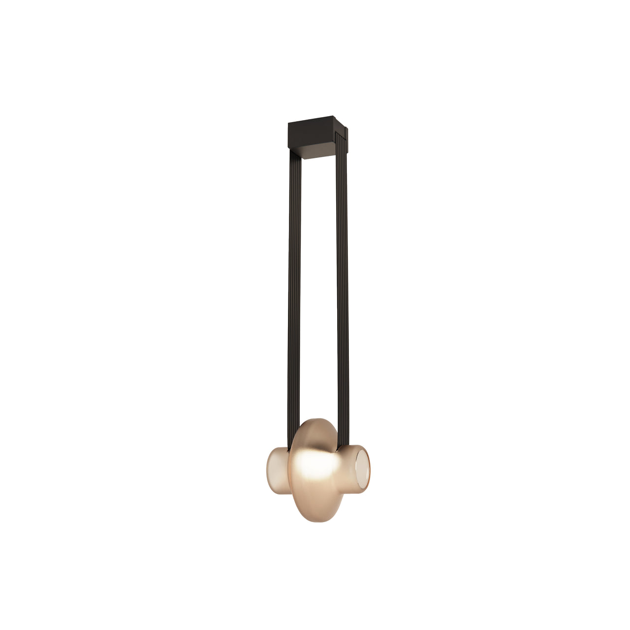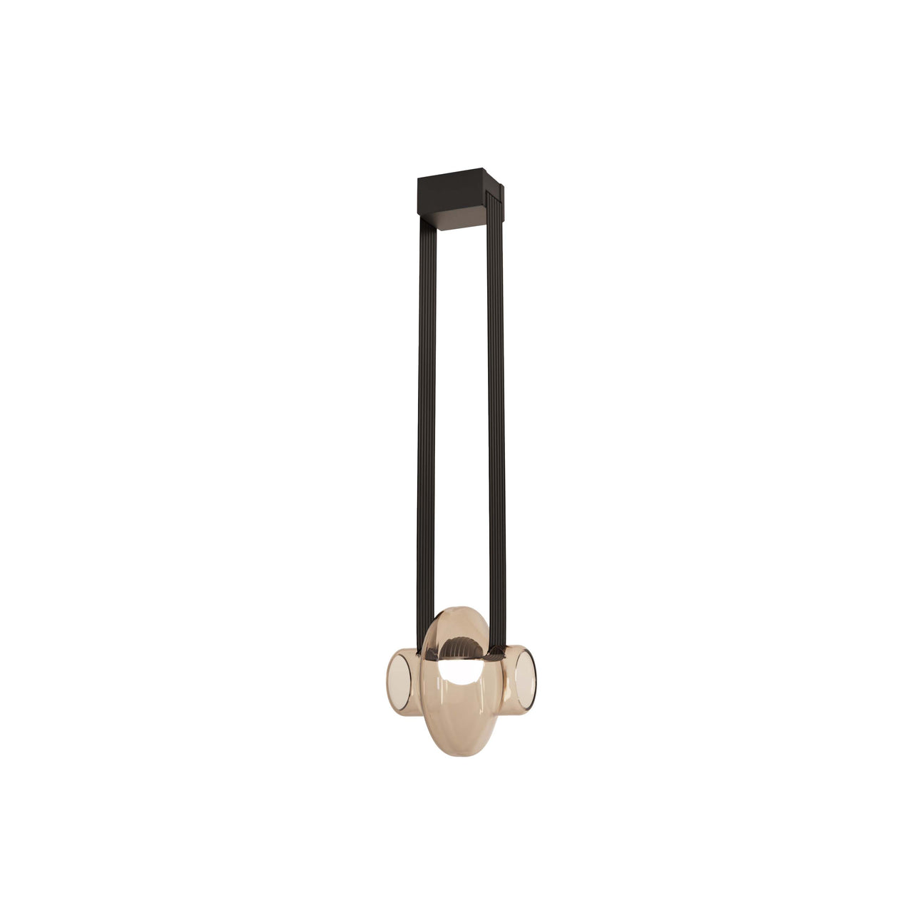 A contemporary lighting system inspired by scenic mountain landscapes and their reflections. It features a wide, flexible, conductive cable that supports and powers the light modules, allowing for versatile configurations. The cable is finished in matte black and designed for creating various geometric and tension-based setups. The lamp includes hand-blown glass globes available in transparent, pink, gray, and amber, with options for clear or frosted finishes. The anodized aluminum and frosted glass light module can direct light either downward or upward.
