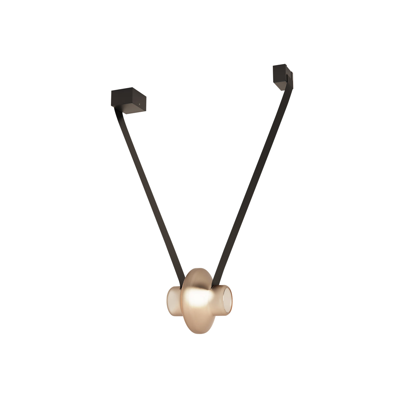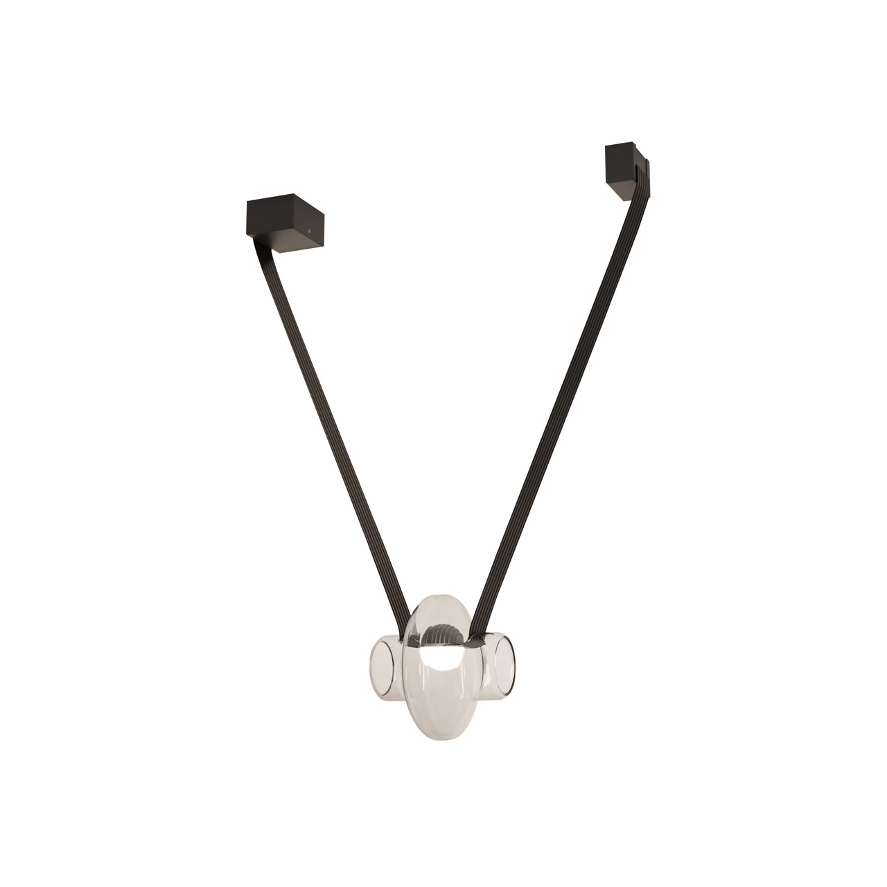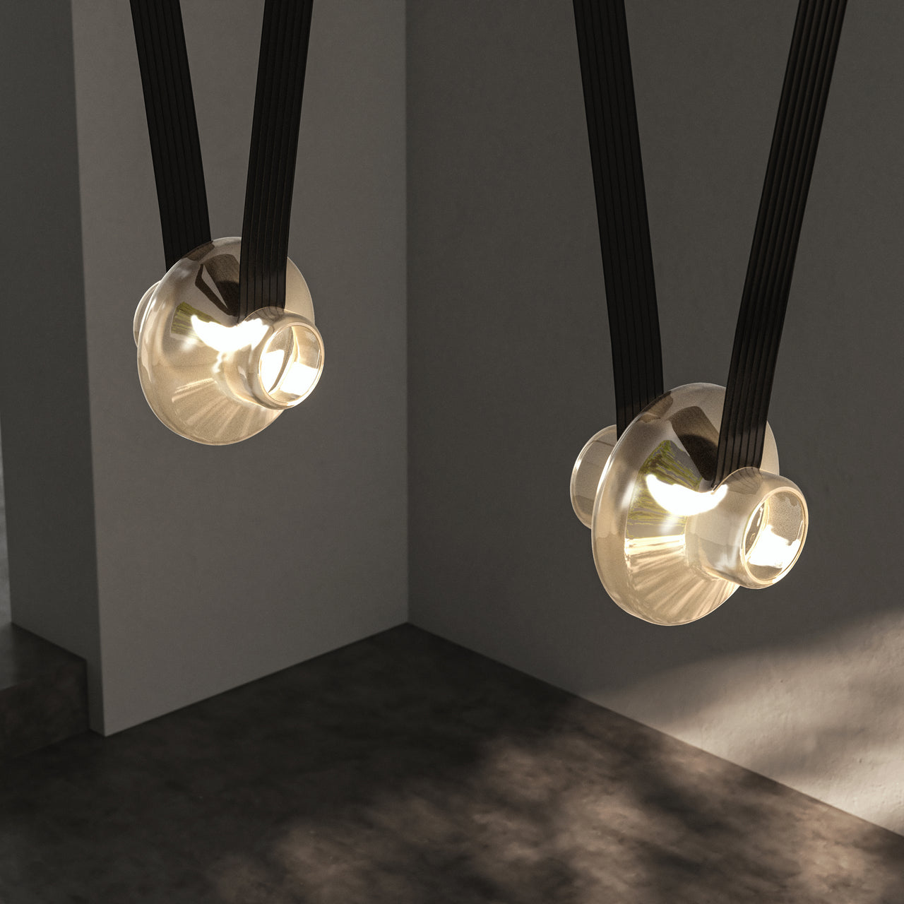A contemporary lighting system inspired by scenic mountain landscapes and their reflections. It features a wide, flexible, conductive cable that supports and powers the light modules, allowing for versatile configurations. The cable is finished in matte black and designed for creating various geometric and tension-based setups. The lamp includes hand-blown glass globes available in transparent, pink, gray, and amber, with options for clear or frosted finishes. The anodized aluminum and frosted glass light module can direct light either downward or upward.