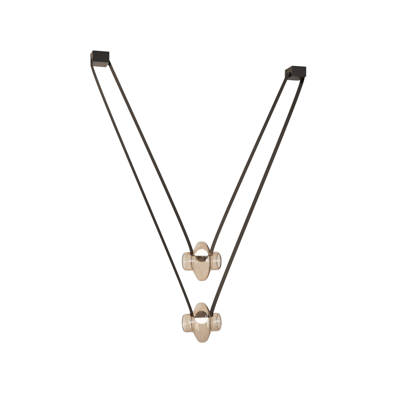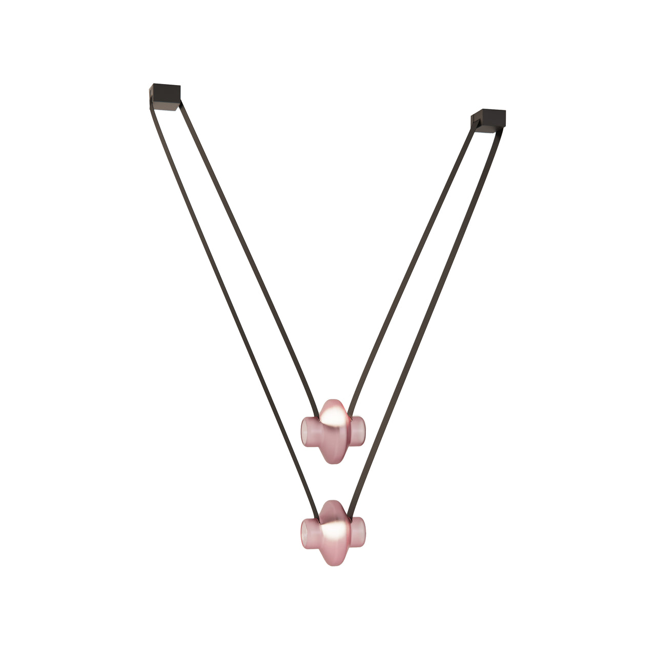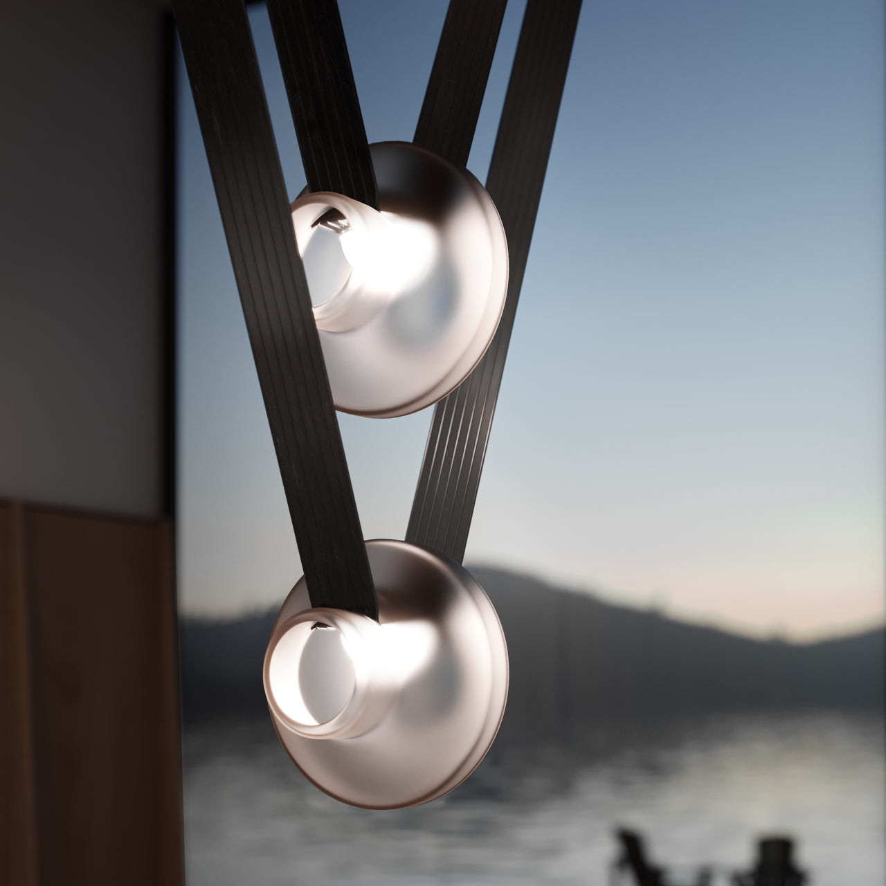 A contemporary lighting system inspired by scenic mountain landscapes and their reflections. It features a wide, flexible, conductive cable that supports and powers the light modules, allowing for versatile configurations. The cable is finished in matte black and designed for creating various geometric and tension-based setups. The lamp includes hand-blown glass globes available in transparent, pink, gray, and amber, with options for clear or frosted finishes. The anodized aluminum and frosted glass light module can direct light either downward or upward.