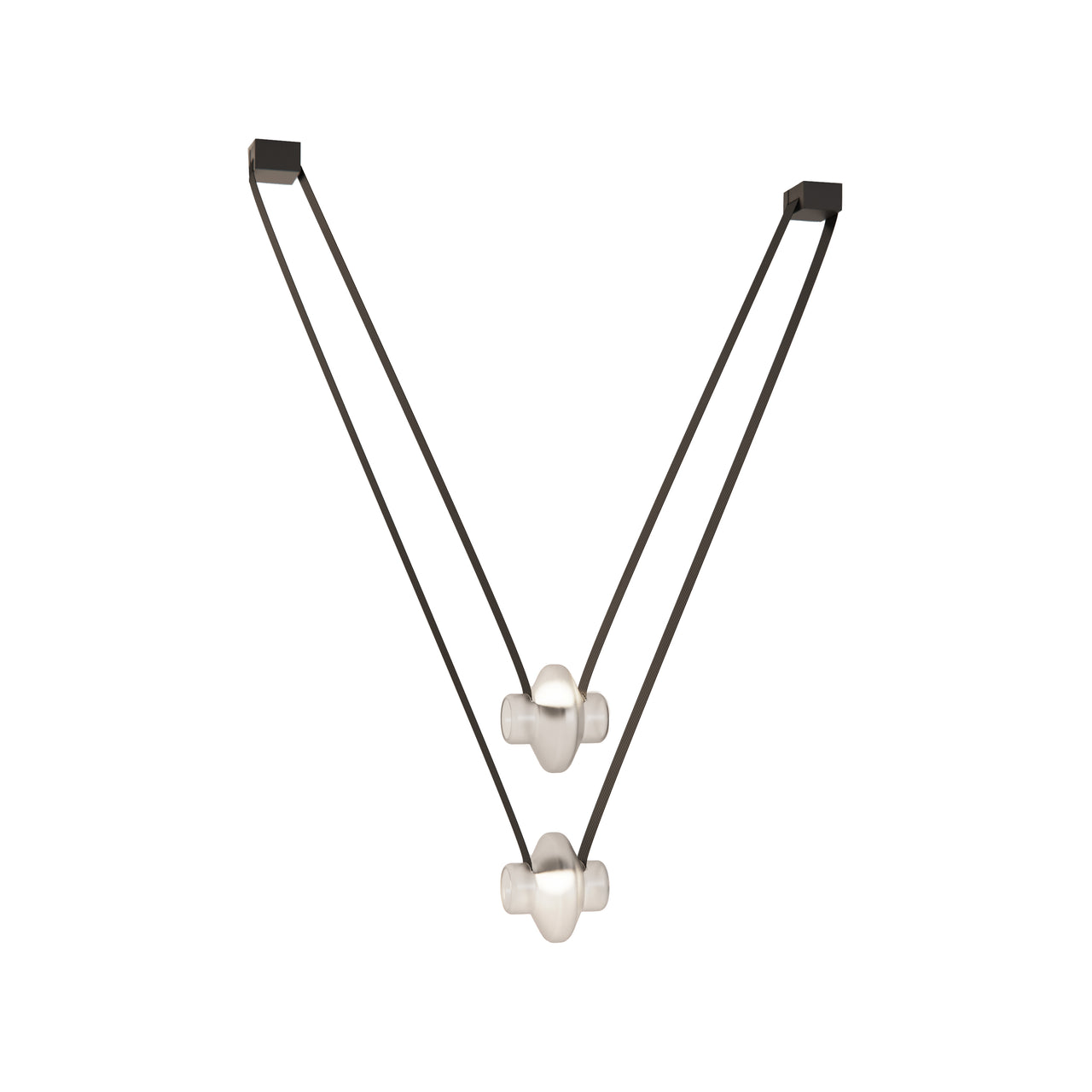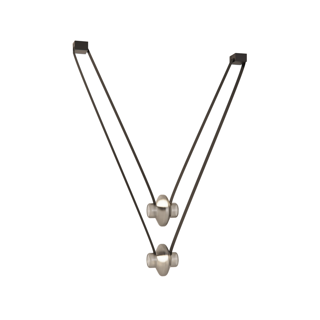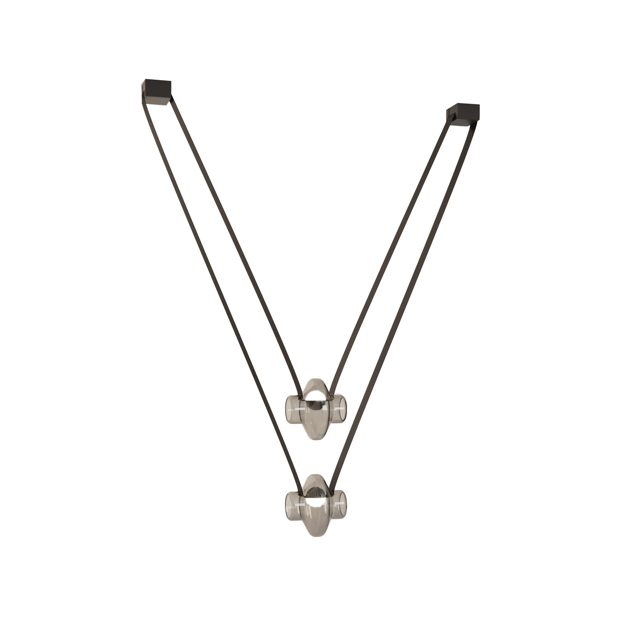 A contemporary lighting system inspired by scenic mountain landscapes and their reflections. It features a wide, flexible, conductive cable that supports and powers the light modules, allowing for versatile configurations. The cable is finished in matte black and designed for creating various geometric and tension-based setups. The lamp includes hand-blown glass globes available in transparent, pink, gray, and amber, with options for clear or frosted finishes. The anodized aluminum and frosted glass light module can direct light either downward or upward.
