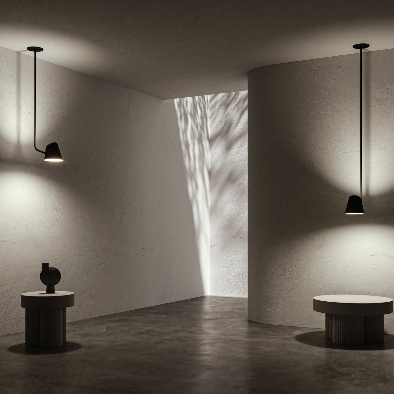 Featuring a sleek, minimalist design, the Hartau Simple Ceiling Lamp by D'Armes offers both functionality and elegance. Designed by Alexandre Joncas, this lamp utilizes precision-machined brass swivels and an aluminum structure to create a refined aesthetic. The lamp's open shades direct light upward and downward, ensuring versatile illumination. Available in finishes like matte black and matte white, with brass or black anodized accents, it fits seamlessly into various settings.